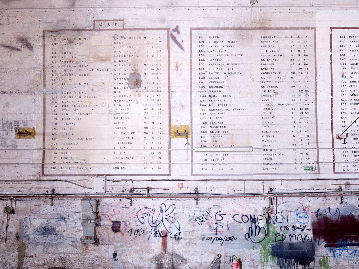 Vue de la peinture murale française de la nef (première partie) : noms des navires passés en entretien du 26 juillet 1956 au 23 avril 1983 avec leur port d'attacheImmatriculation