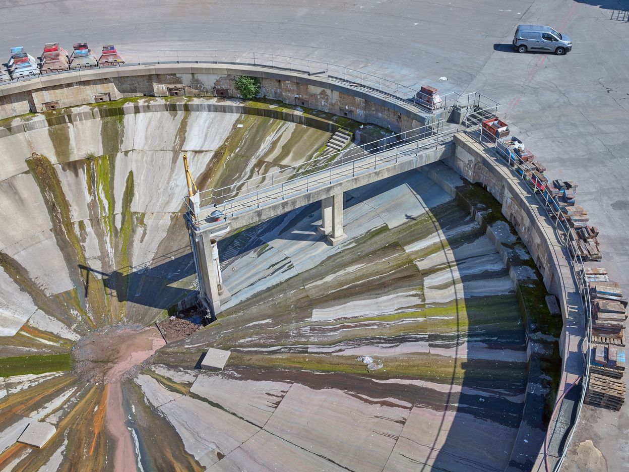 Vue de la fosse du slipway depuis le sommet de l'élévateur à bateauxImmatriculation