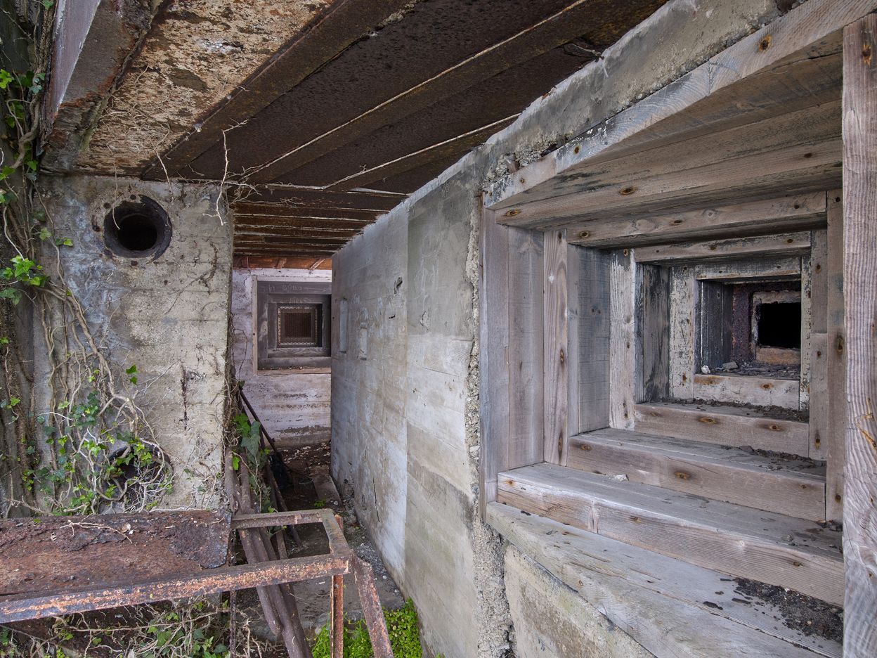 Vue de l'embrasure pour mitrailleuse de la casemate située à l'angle sud-est du bunker "KIII". Il s'agit d'une embrasure à coffrage perdu en bois. Au centre, la seconde embrasure correspond à la défense de l'entrée. Sur les murs, graffitis de soldats de toute époqueImmatriculation