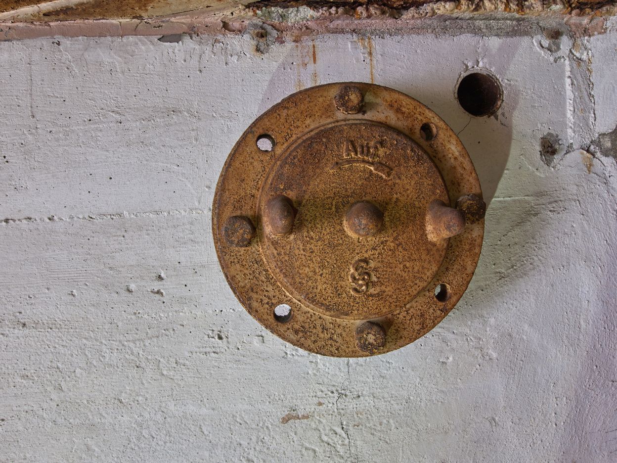 Vue de détail d'un clapet à vis. Marquage "Aus" (en dehors)Immatriculation