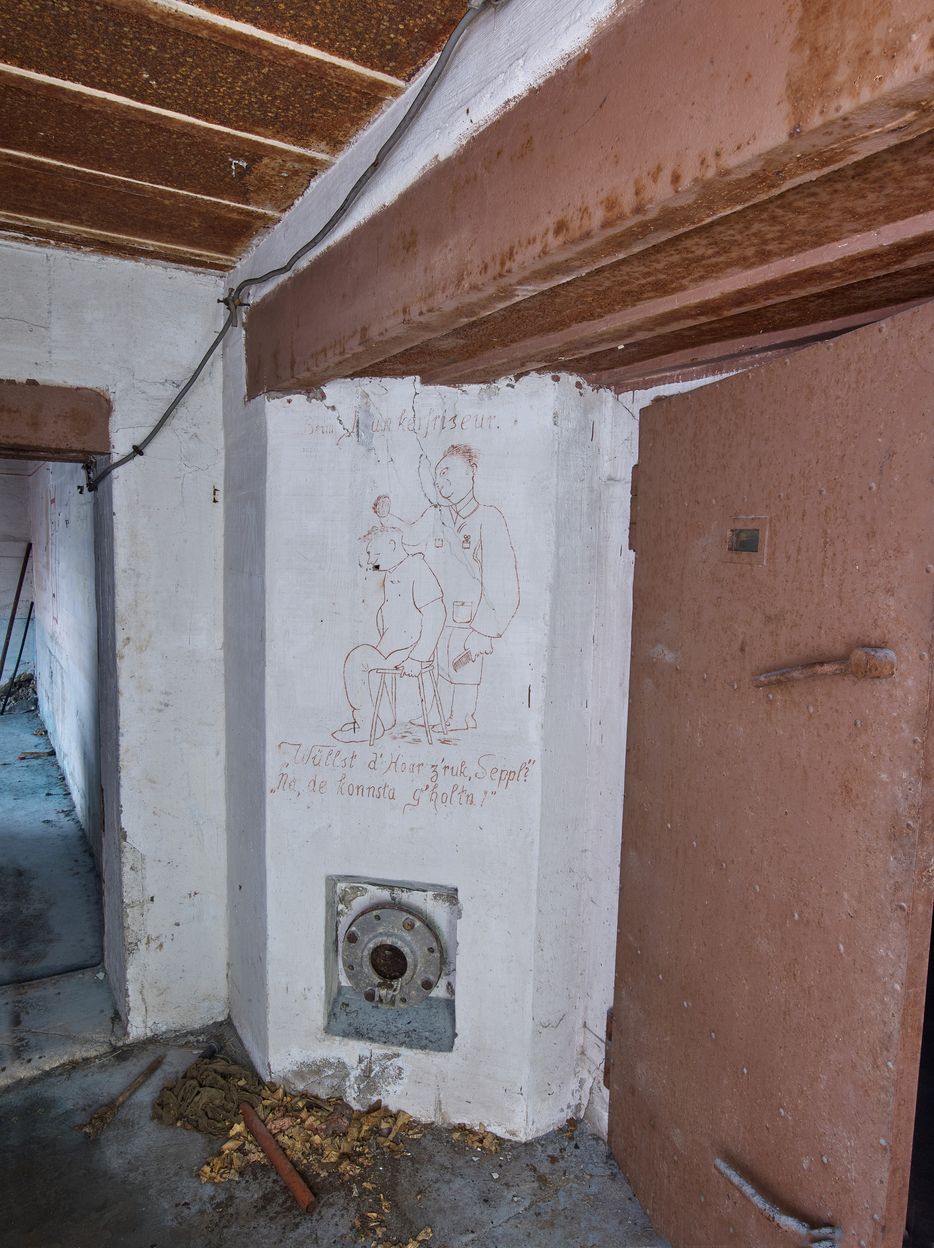 Vue de situation de l'une des peintures murales allemandes (située dans le couloir principal). En bas, clapet de surpression. A droite, porte étancheImmatriculation