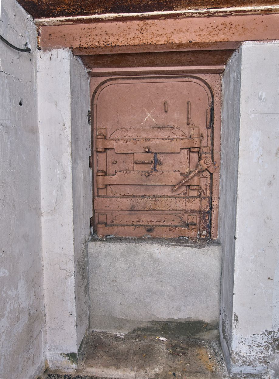 Vue de la sortie de secours en partie murée : porte étanche à deux vantauxImmatriculation