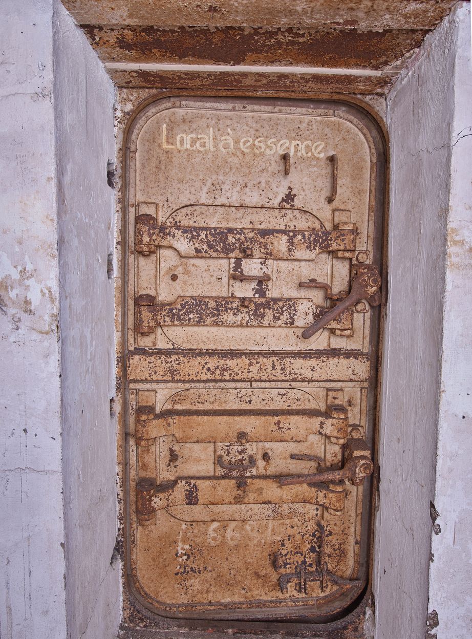 Vue de l'une des portes blindées à deux vantaux (position fermée). On peut lire l'instruction suivante en français : "Local à essence". Les vantaux sont également numérotésImmatriculation