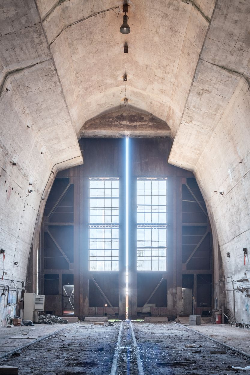 Vue axiale de la nef vers le nord. Au sol, les quatre rails spéciaux du berImmatriculation