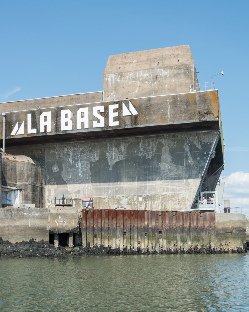 Vue de l'entrée du slipway, élévation ouest. Le bunker "KI" est surmonté d'un envuvement pour un canon antiaérien. A gauche, embrasure de la casemate de flanquementImmatriculation