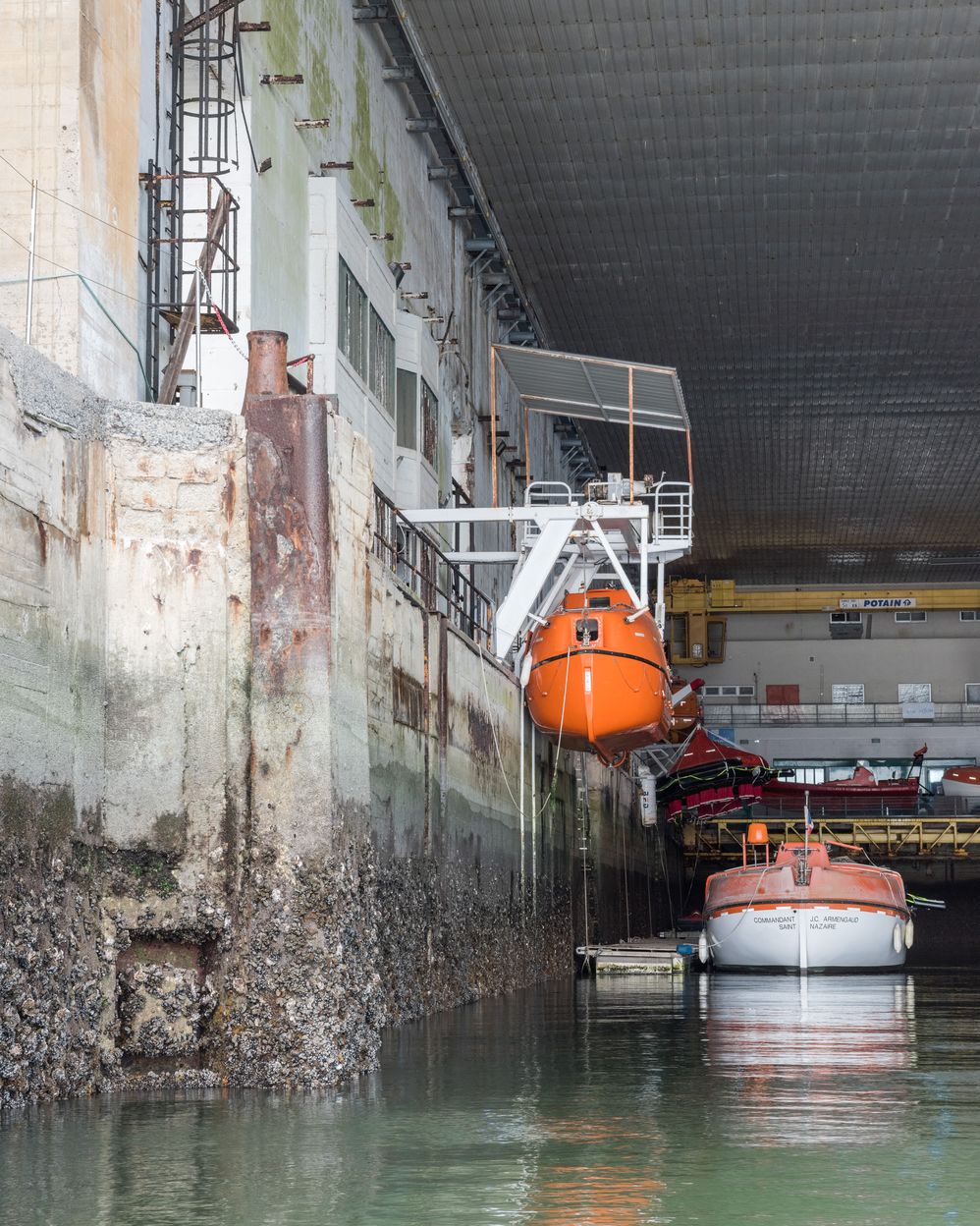 Vue de l'alvéole E (n° 17 et 18). Cette alvéole est utilisée pour l'entraînement à la survie en mer par le Centre d'Étude et de Pratique de la Survie de Lorient. Ici, deux chaloupes de sauvetage de type baleinièreImmatriculation