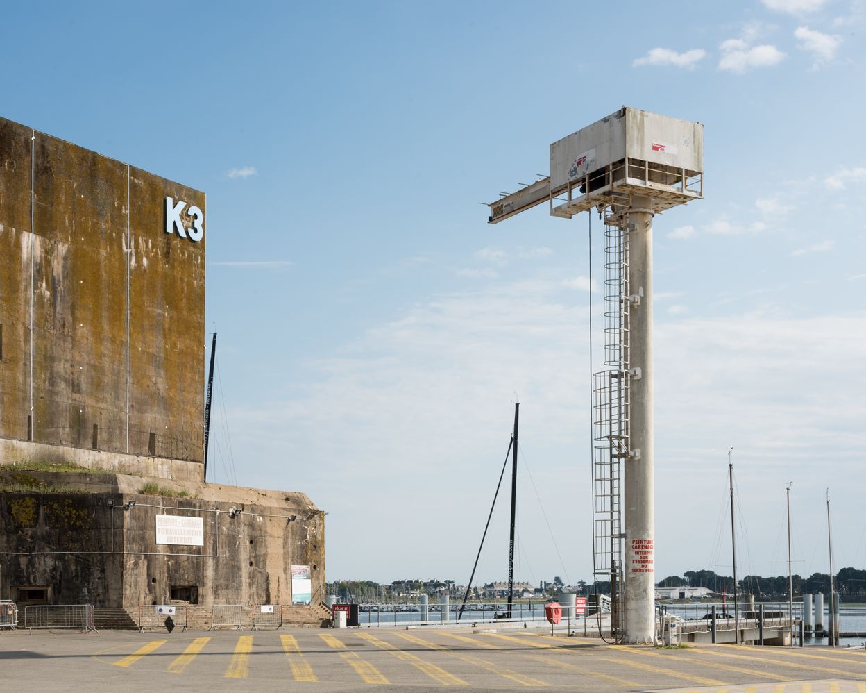 Vue de l'angle ouest flanqué d'une casemate pour quatre mitrailleuses. A droite, grue du portImmatriculation