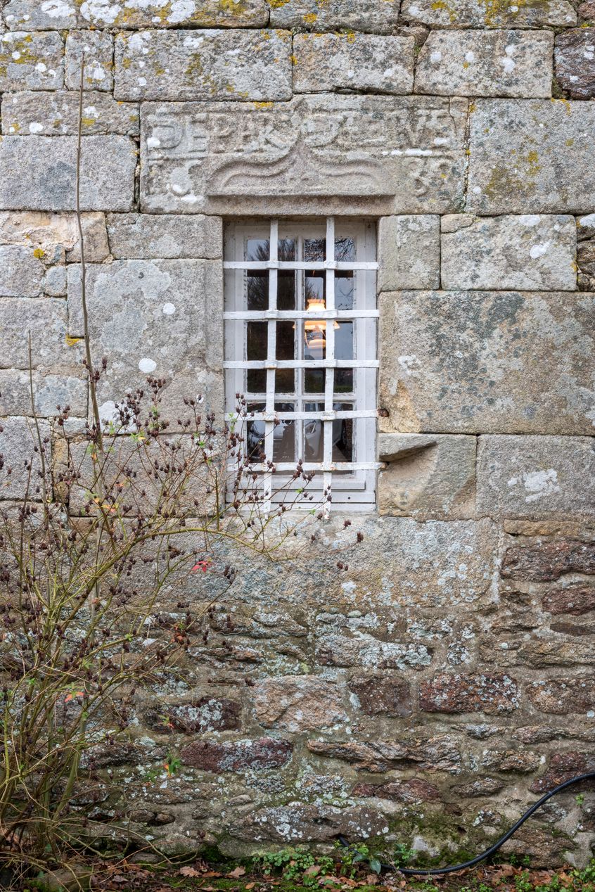 Fenêtre de la salle, portant date et inscription : DE PAR DIEIUE (Dieu), 1588Immatriculation