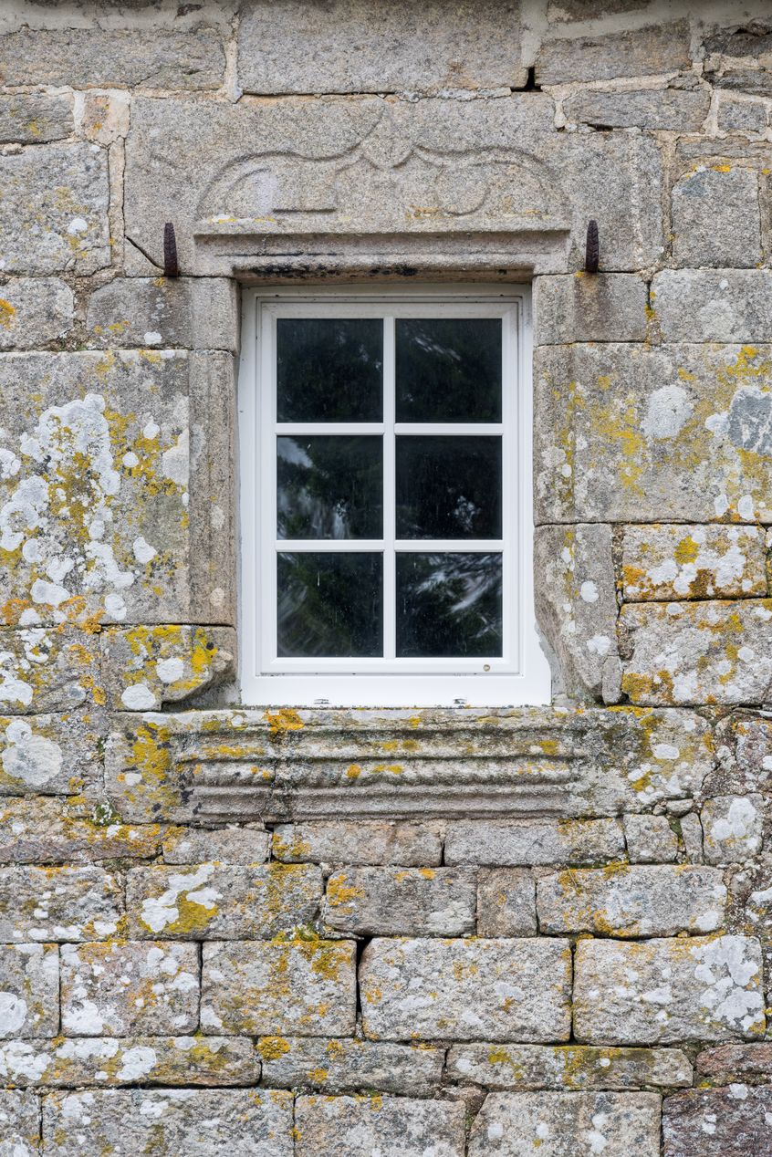 Fenêtre de la chambre de l'étage, avec décor d'accolade et appui mouluré. Dans l'accolade sont sculptés le calice, le livre et la patène.Immatriculation