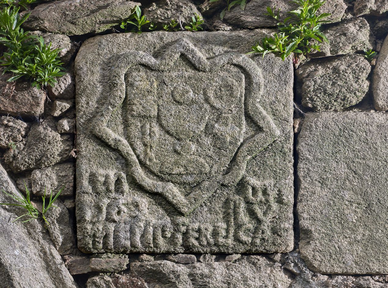 Vue de détail de la pierre sculptée avec les attributs du prêtre: calice, burettes, patène et livreImmatriculation