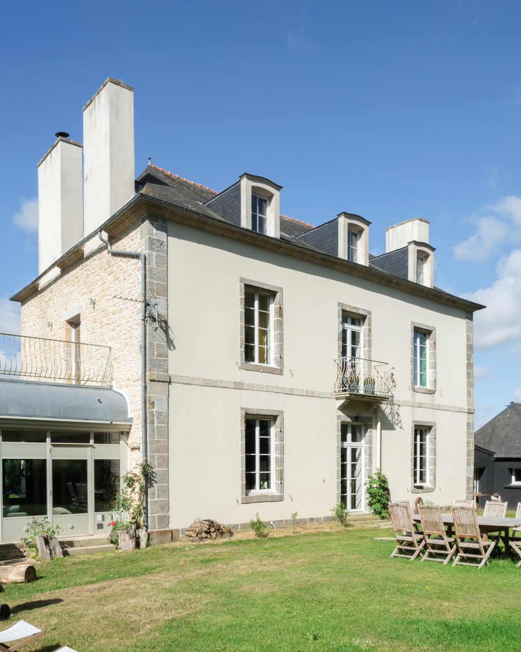 Vue générale de trois-quarts, façade sur jardin avec pavillon nord, état en 2022Immatriculation