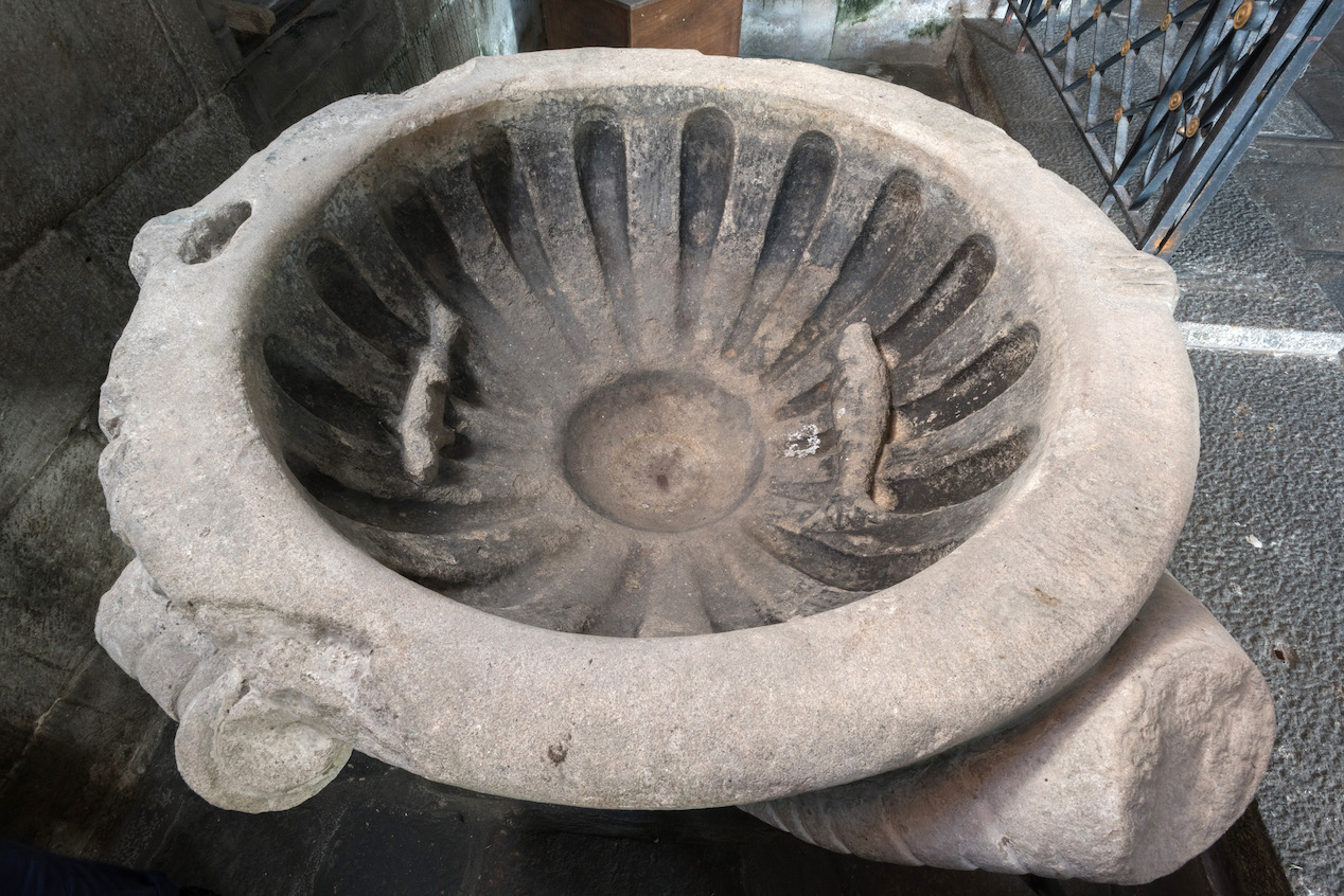 Fonts baptismaux, vue de détail de la cuve en plongée, avec les poissons sculptésImmatriculation