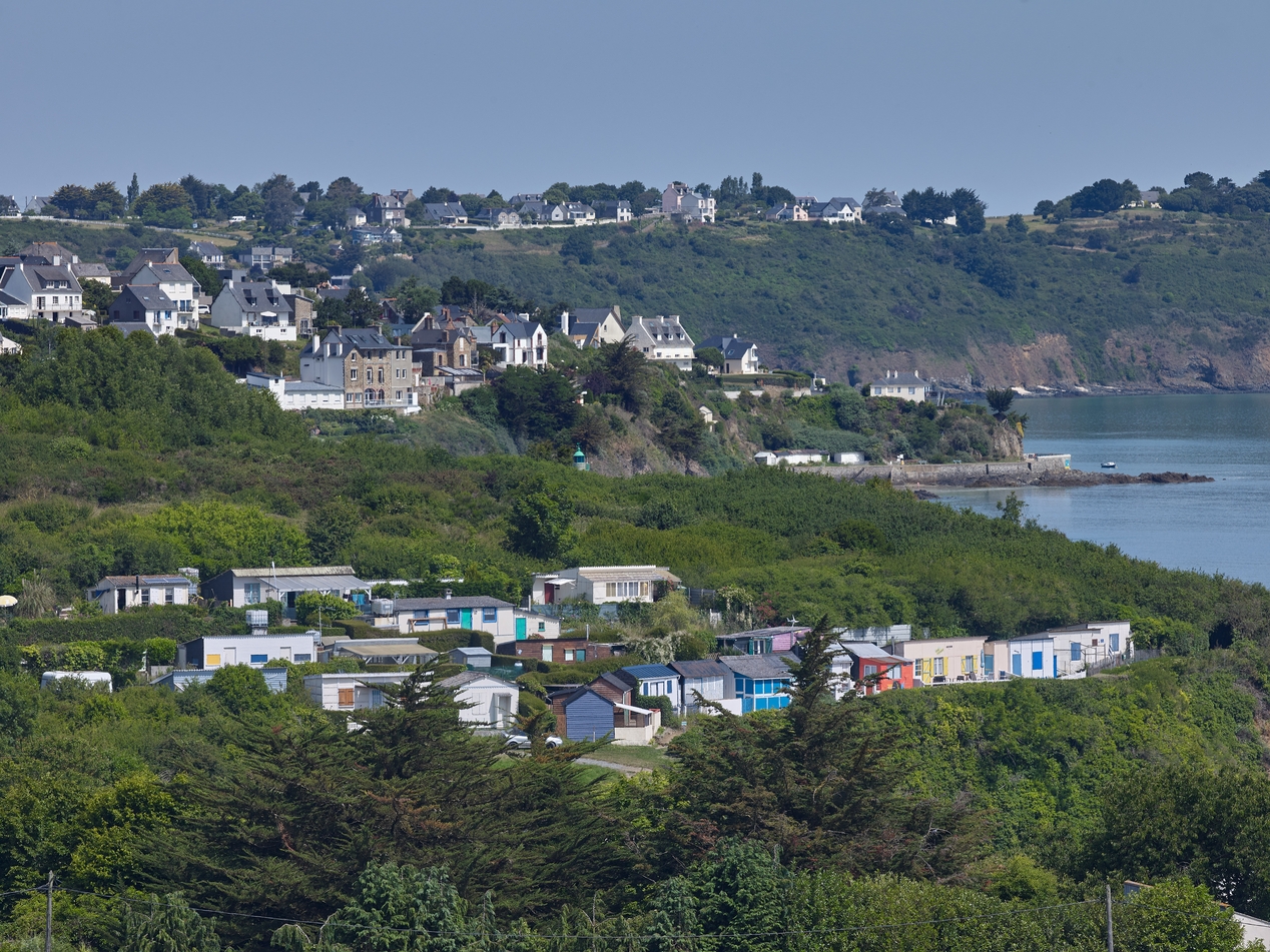 Vue générale des cabanons du Valais. Au second plan, les villas balnéaires de Plérin.Immatriculation
