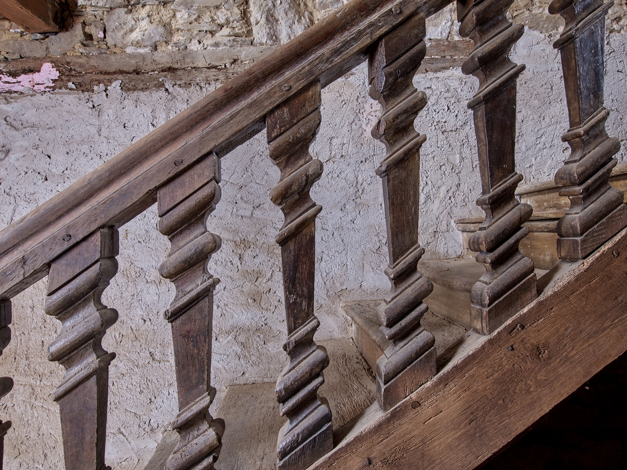 Maison. vestibule d'entrée. Escalier à retours en bois. Détail des balustres soutenant la main couranteImmatriculation