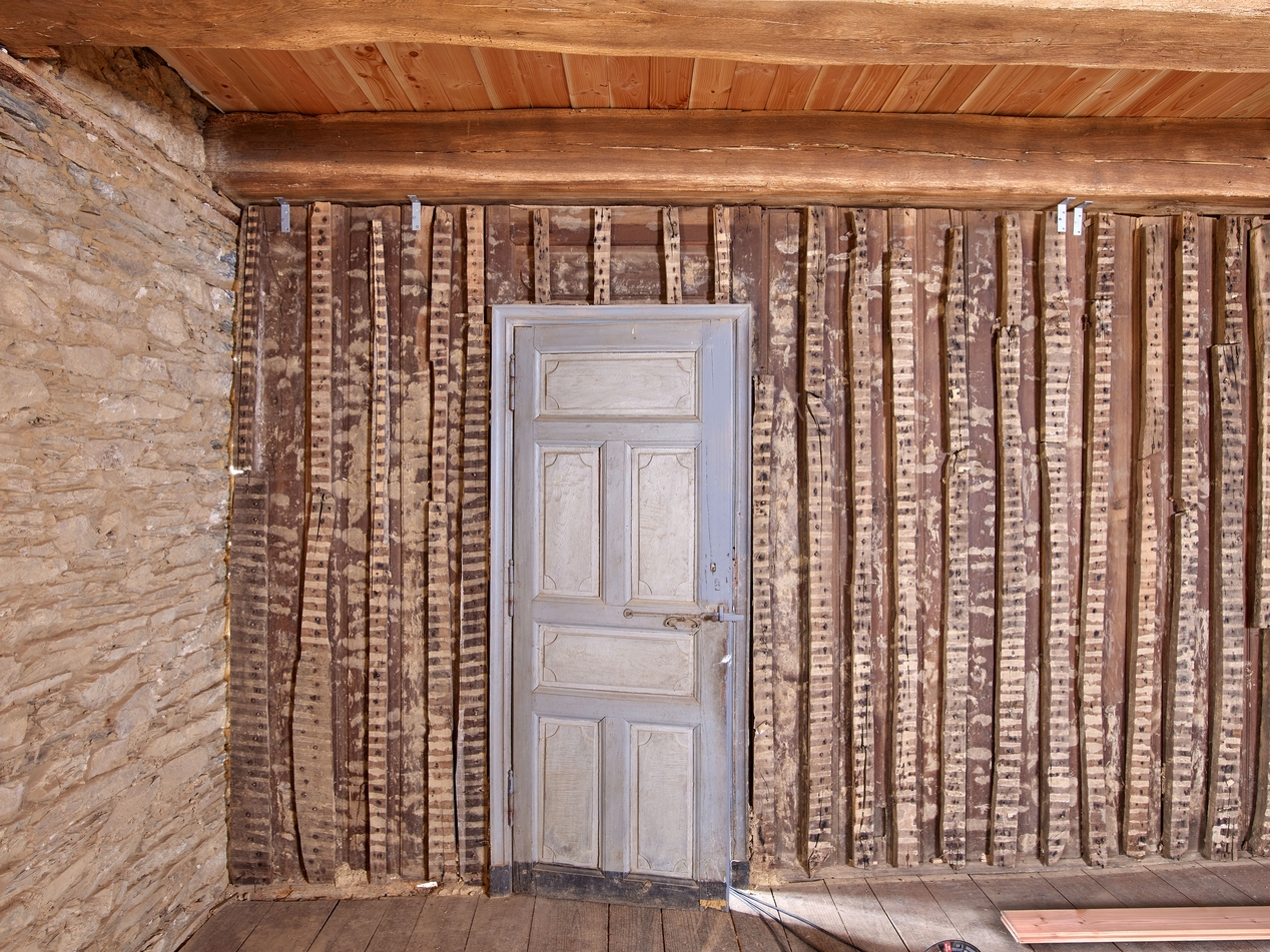 Maison. Chambre au-dessus de la salle : cloison dépourvue de son lambris et porte donnant sur le palier de l'escalierImmatriculation