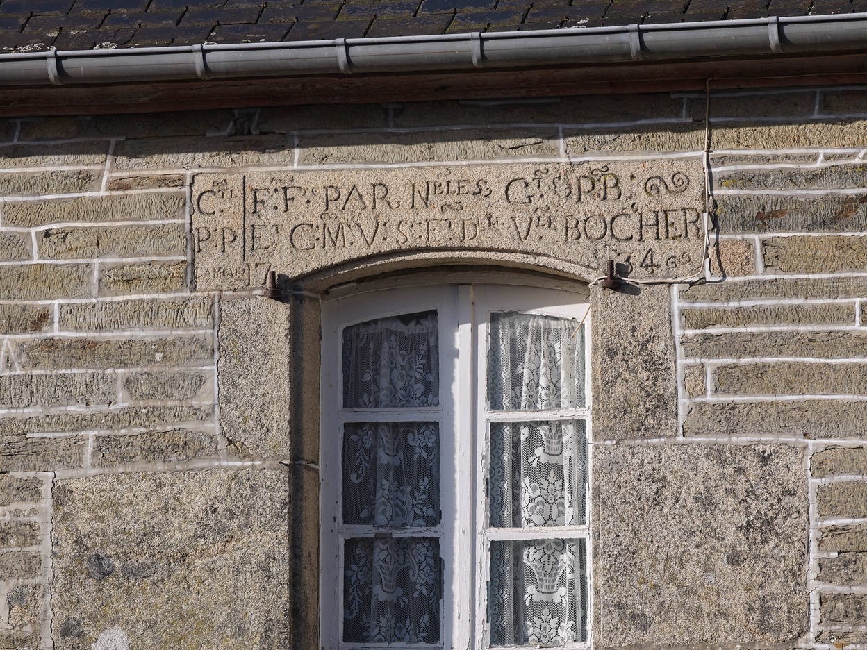 Logis principal. Façade antérieure. Détail de l'inscription gravée sur le linteau d'une fenêtre de l'étageImmatriculation