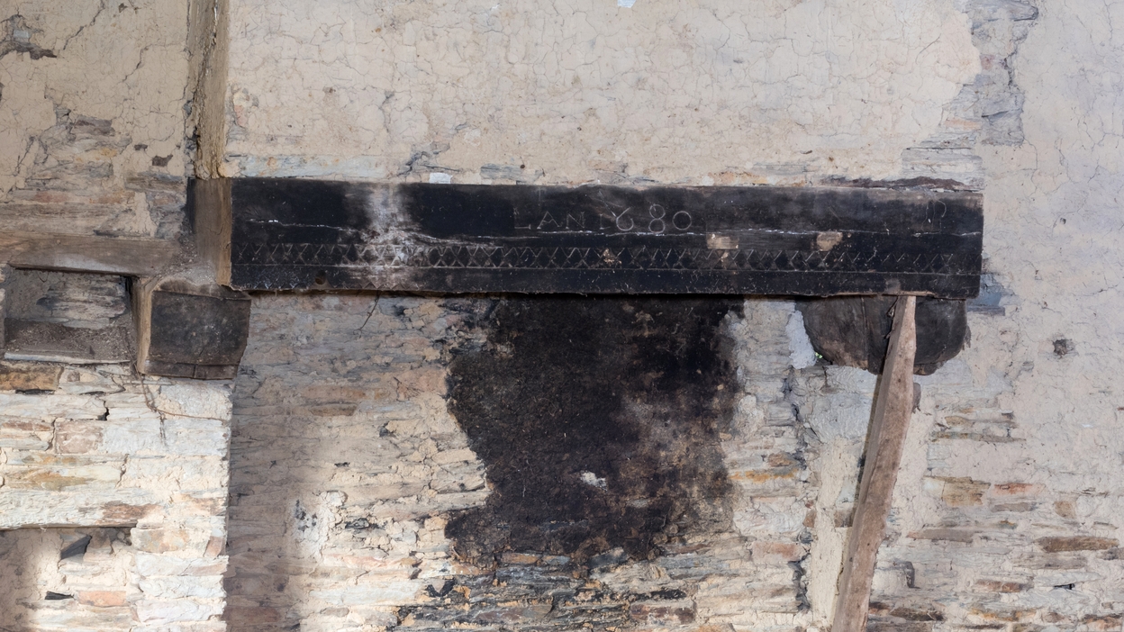 Détail du linteau gravé (1680) de la cheminée ouestImmatriculation