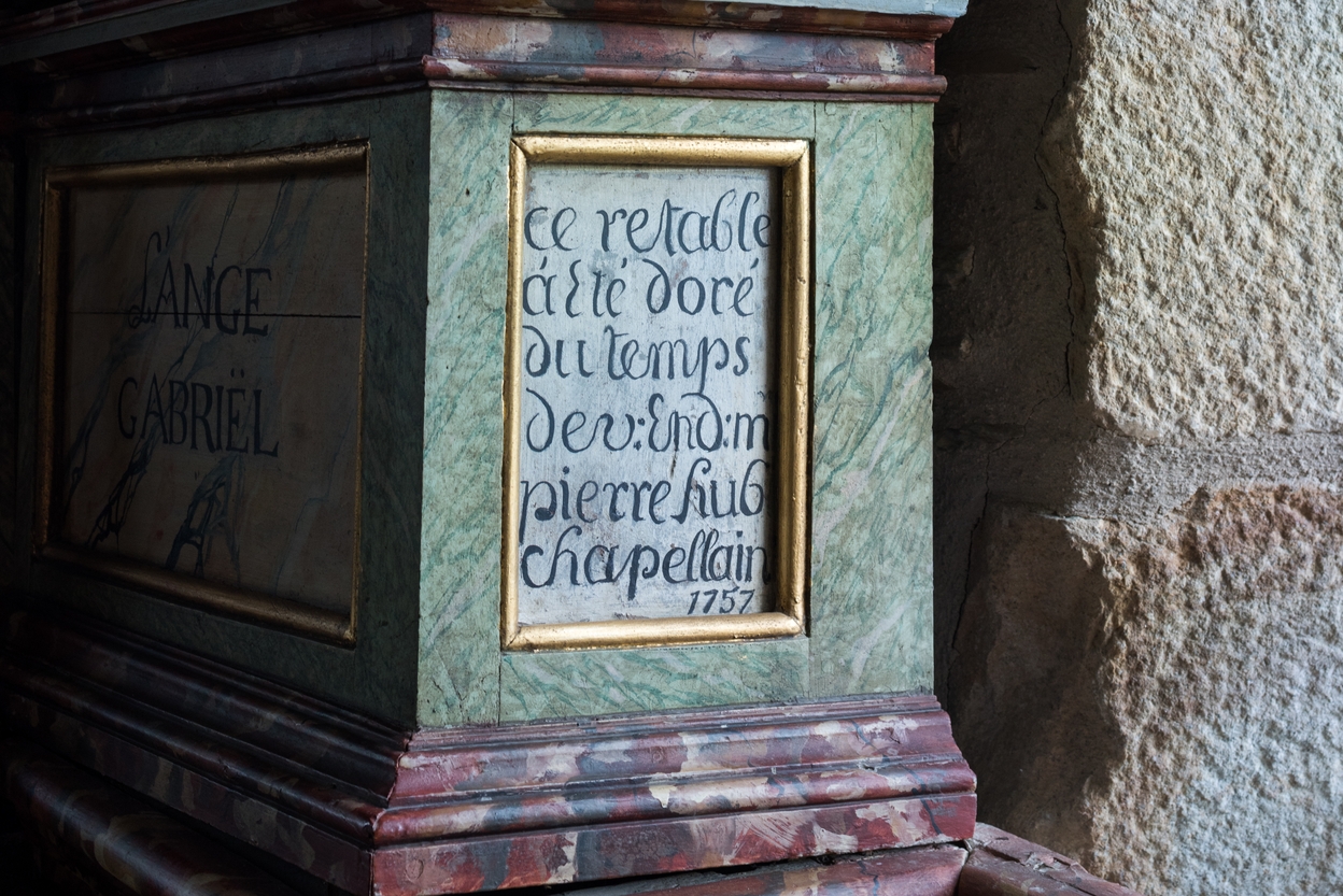 Retable du maître-autel. Détail de l'inscription ("Ce retable a été doré du temps de Pierre Hub chapelain, 1757")Immatriculation