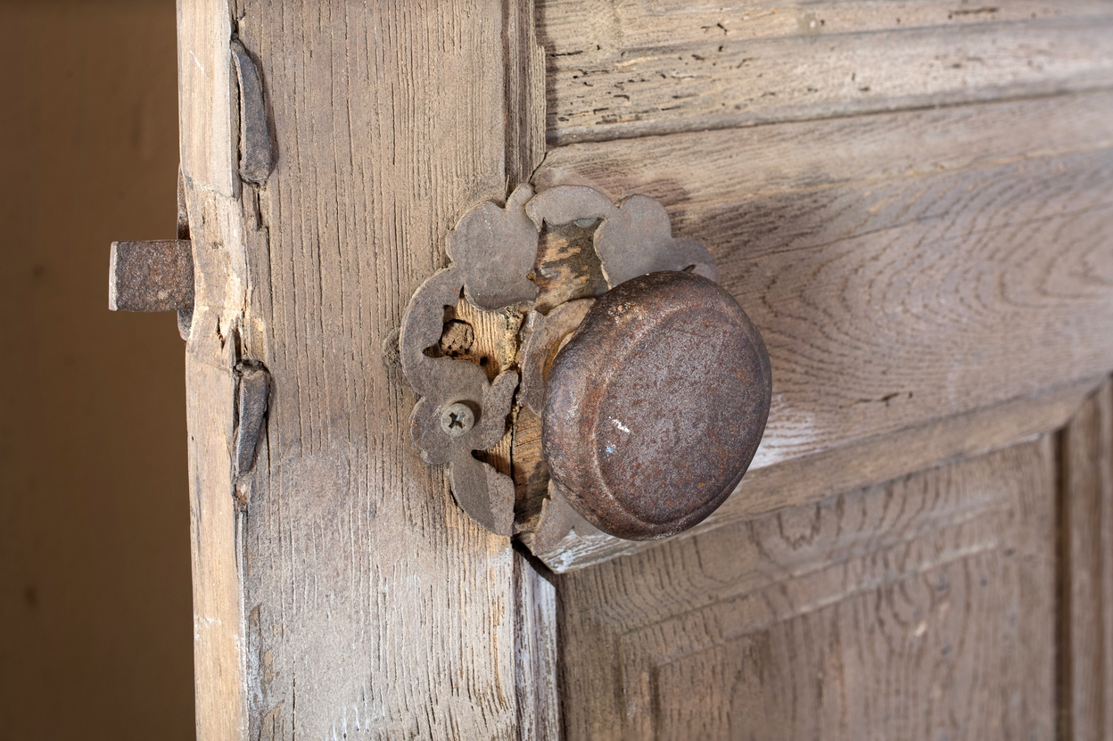 Logis. Palier du premier étage. Porte de la chambre est. Détail de la poignée et du loquetImmatriculation