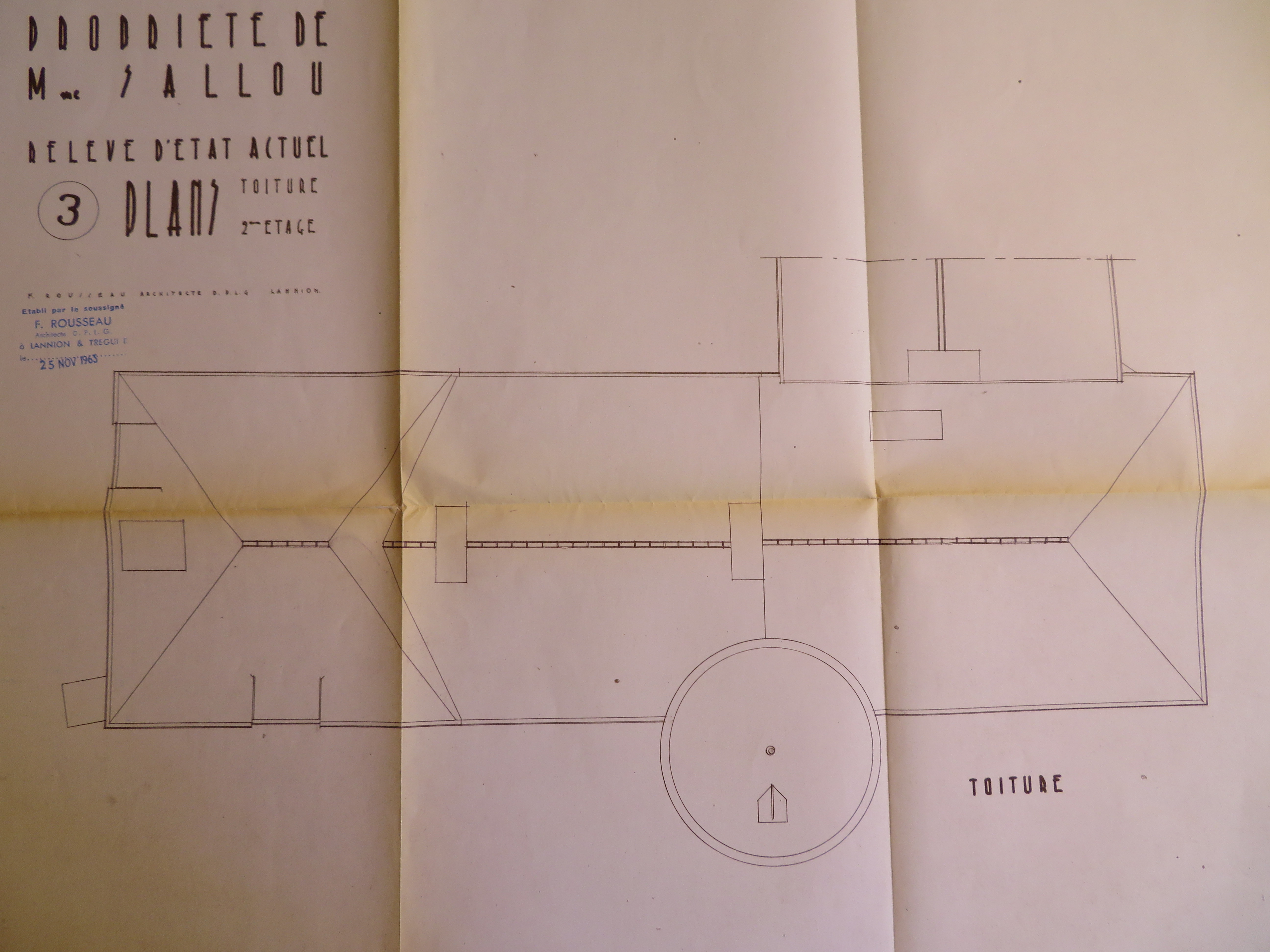 Plan de la toiture daté du 25 novembre 1963 par F. Rousseau, architecte Diplômé par le gouvernement (DPLG)-