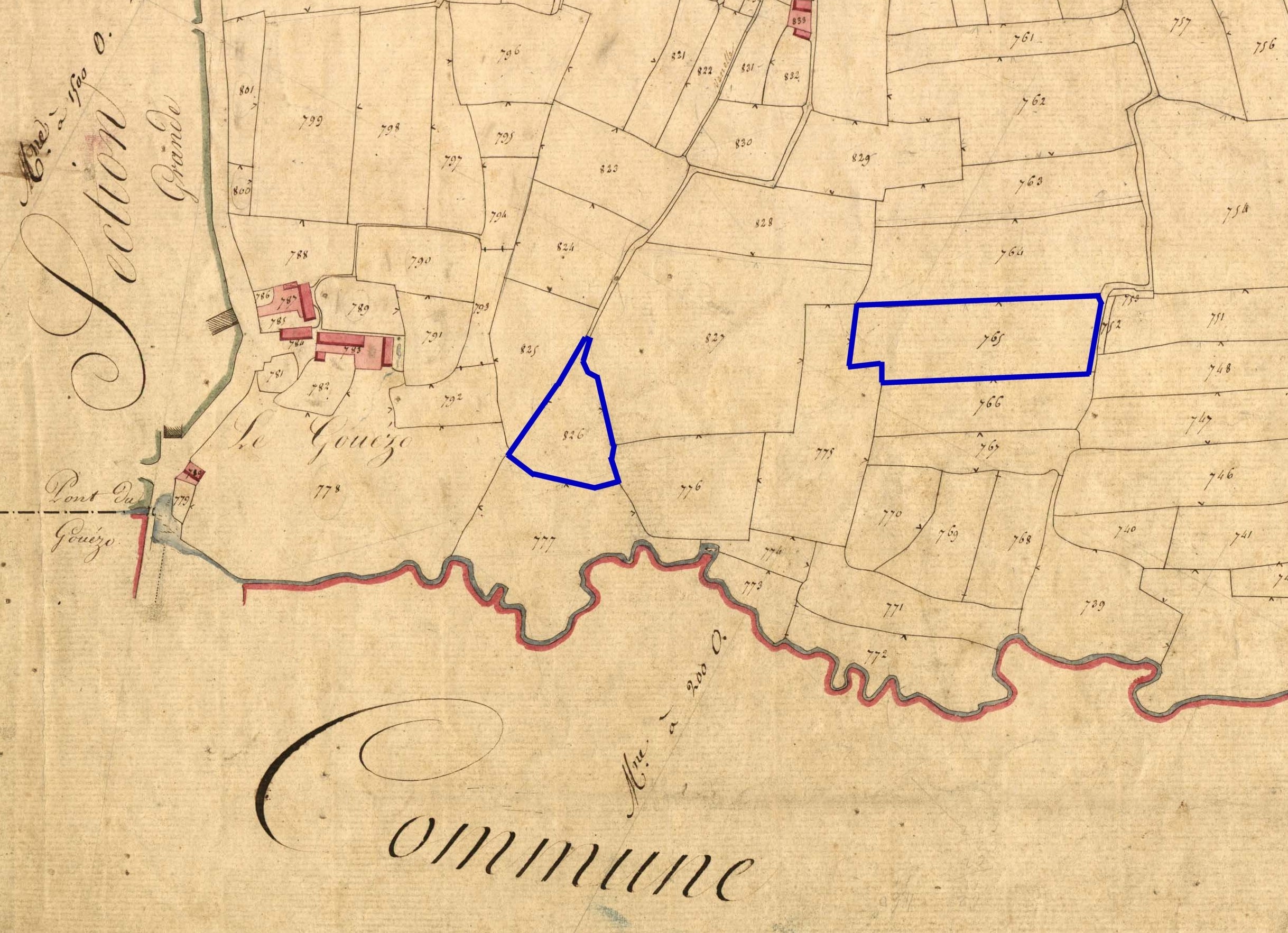 La Gouézo en 1828. Extrait du cadastre ancien, section C2. Etendoirs entourés en bleu (série 3 P 335, Archives départementales des Côtes-d'Armor)Immatriculation