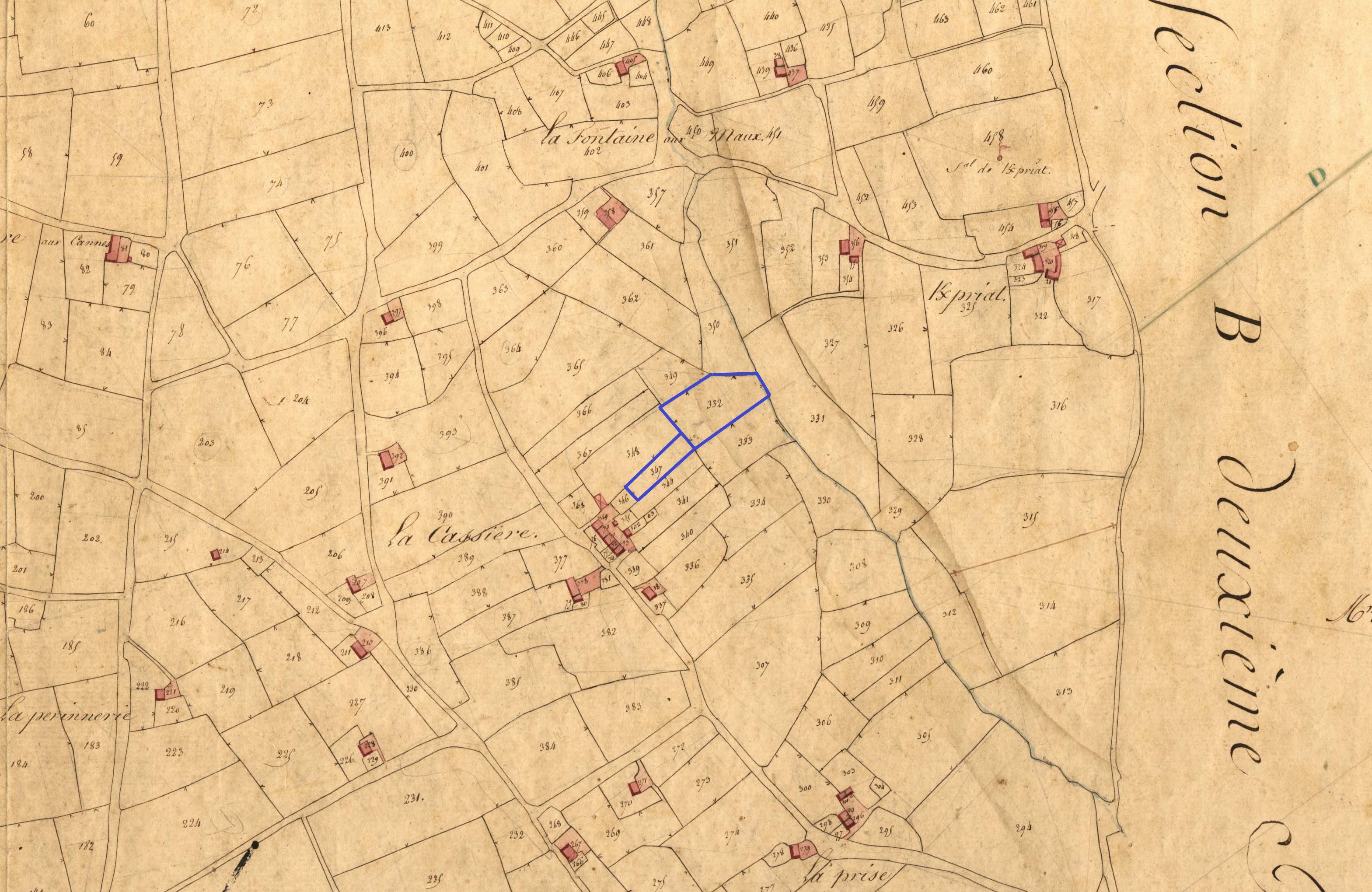 La Cassière en 1828. Extrait du cadastre ancien, section B1. Etendoirs entourés en bleu (série 3 P 335, Archives départementales des Côtes-d'Armor)Immatriculation