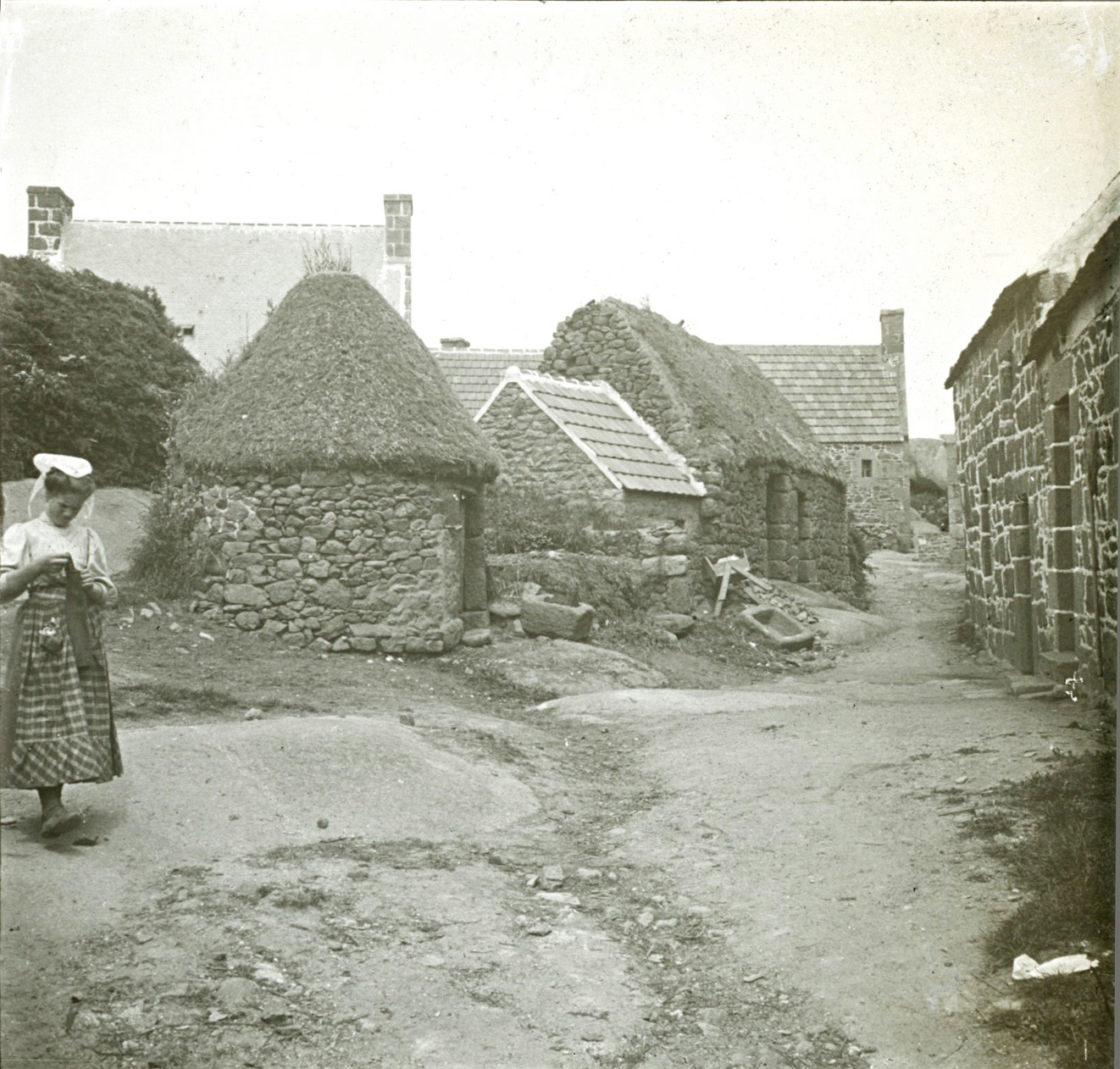 Toiture récente en tuiles au milieu de celles en chaume à Ploumanach, vers 1900 (collection : André le Person)Immatriculation