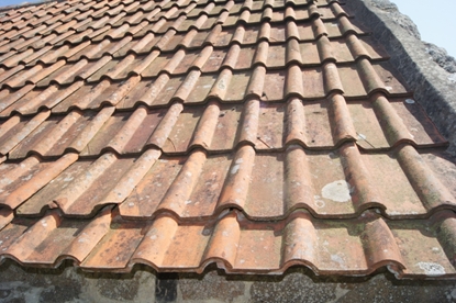 Couverture en tuiles remplaçant un toit en chaume : exemple d'un solin en béton liant les tuiles à la chevronnièreImmatriculation