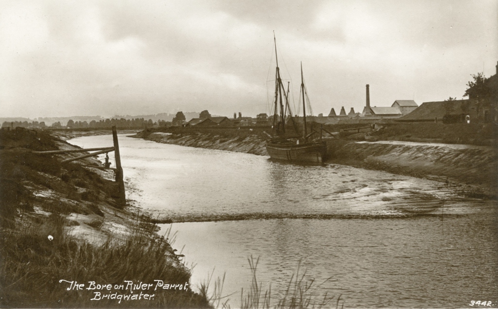 Mascaret sur la rivière Parrett (the Bore on River Parret, Bridgwater ; 3442) (collection Roger Evans). A l’horizon, les fours de la tuilerie Barham BrothersImmatriculation