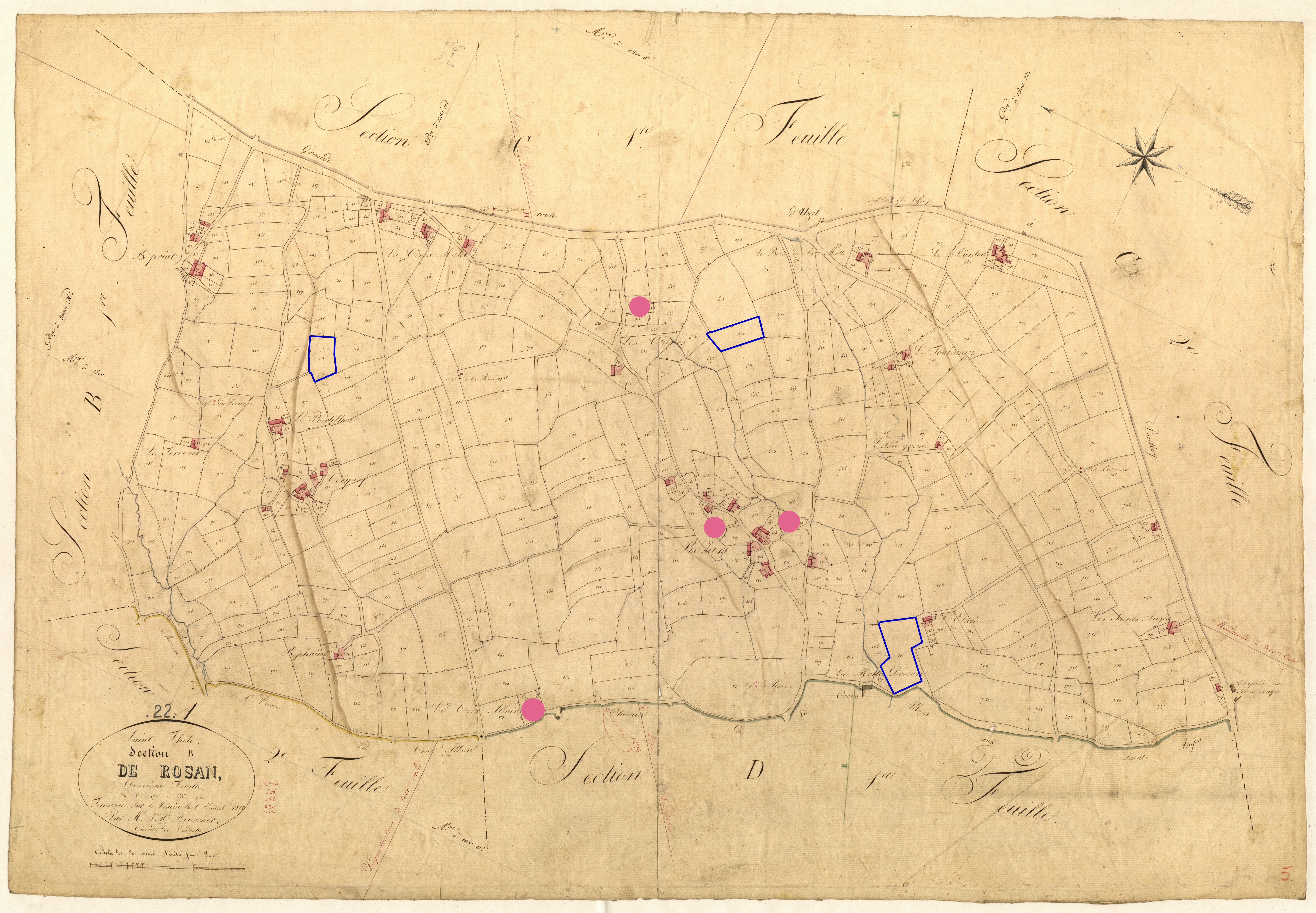Localisation des étendoirs (parcelles entourées en bleu), maisons de tisserands et/ou de marchands (points roses) d'après les états de section de 1829, section B2 (série 3 P 335, Archives départementales des Côtes-d'Armor)Immatriculation