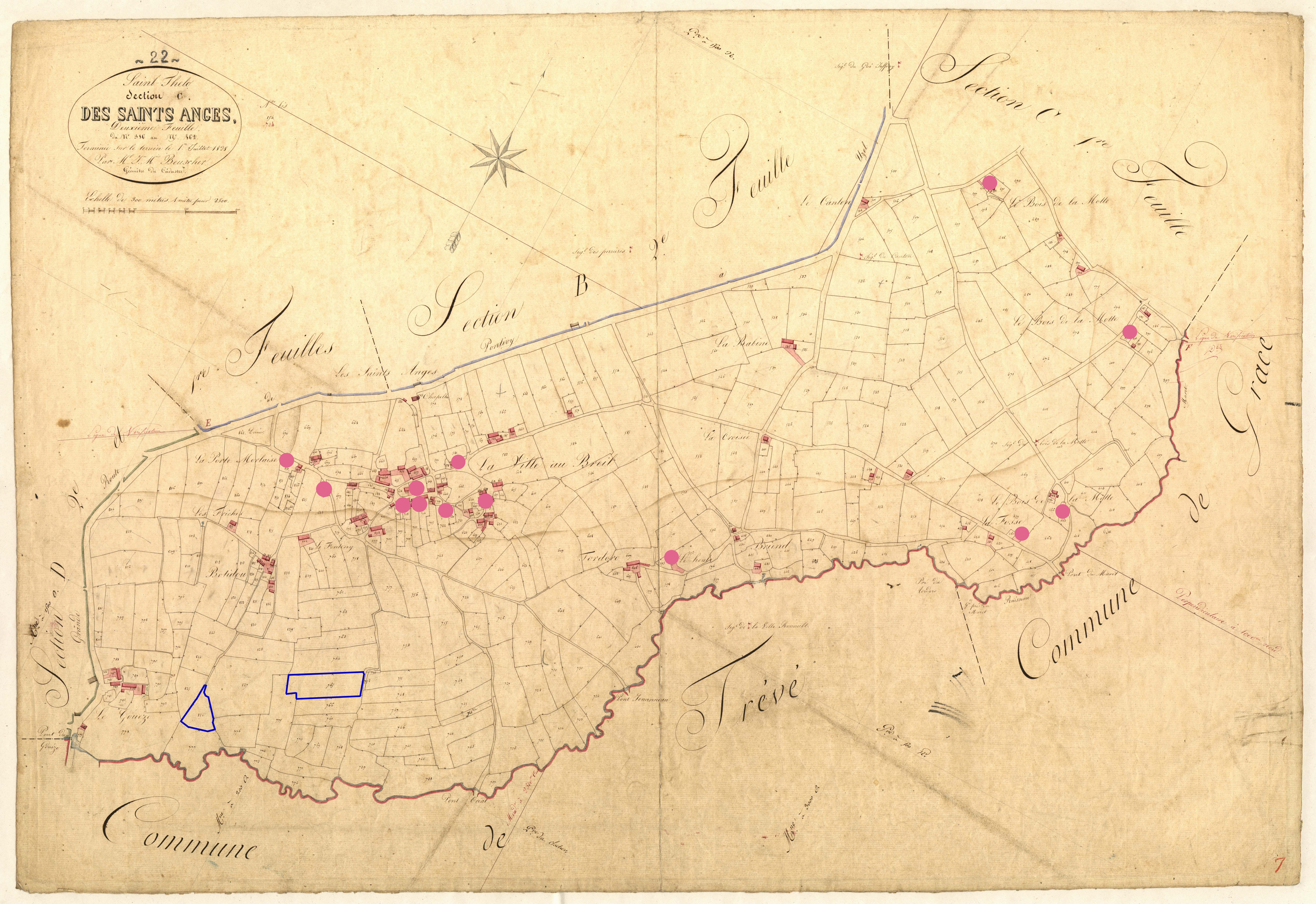 Localisation des étendoirs (parcelles entourées en bleu), maisons de tisserands et/ou de marchands (points roses) d'après les états de section de 1829, section C1 (série 3 P 335, Archives départementales des Côtes-d'Armor)Immatriculation