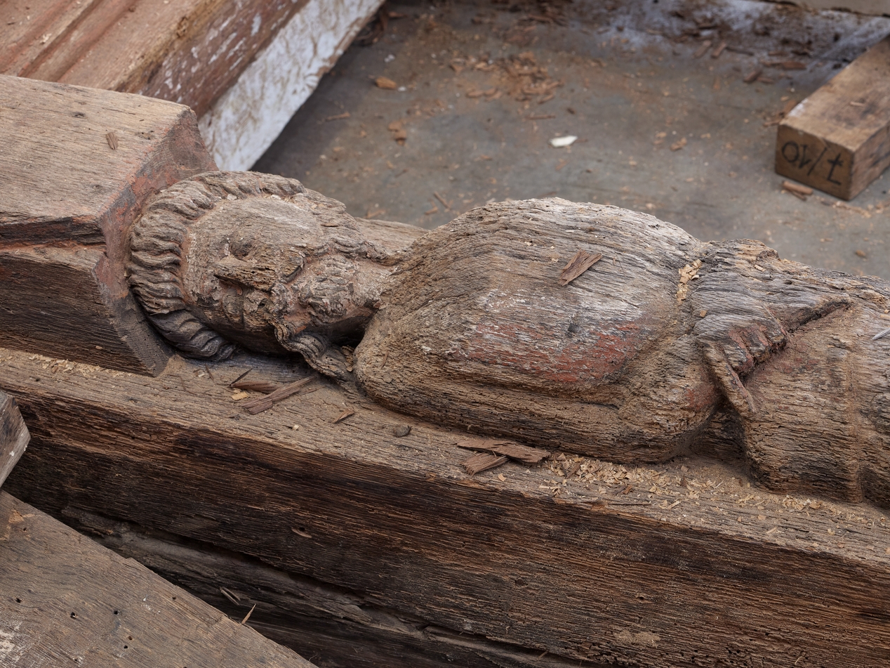 Personnage masculin sculpté sur l'un des poteaux de la façade.Immatriculation