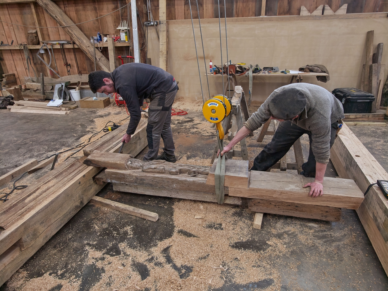 Restauration de la façade en atelier. Test d'assemblage entre un poteau et la sablière basse.Immatriculation