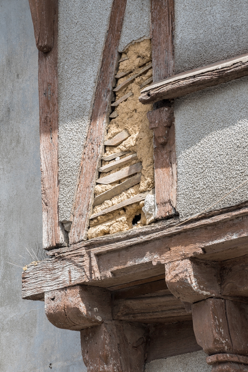 Torchis apparent sous l'enduit ciment.Immatriculation