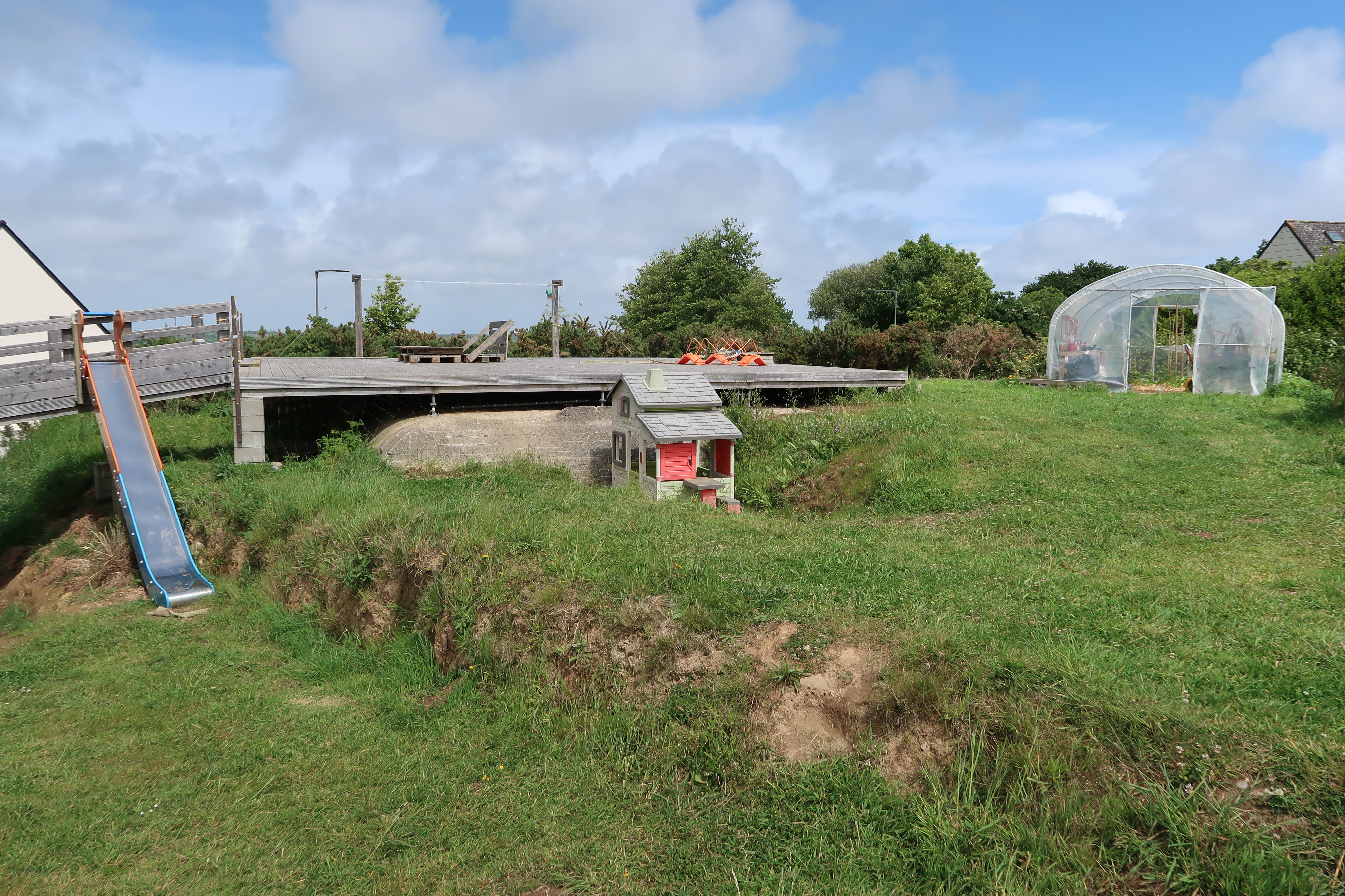 Vue de situation (état en 2022). Un plancher a été construit sur le bunker afin de recevoir un bâtiment servant de partie commune au logement collectif de la rue des MaquisardsImmatriculation