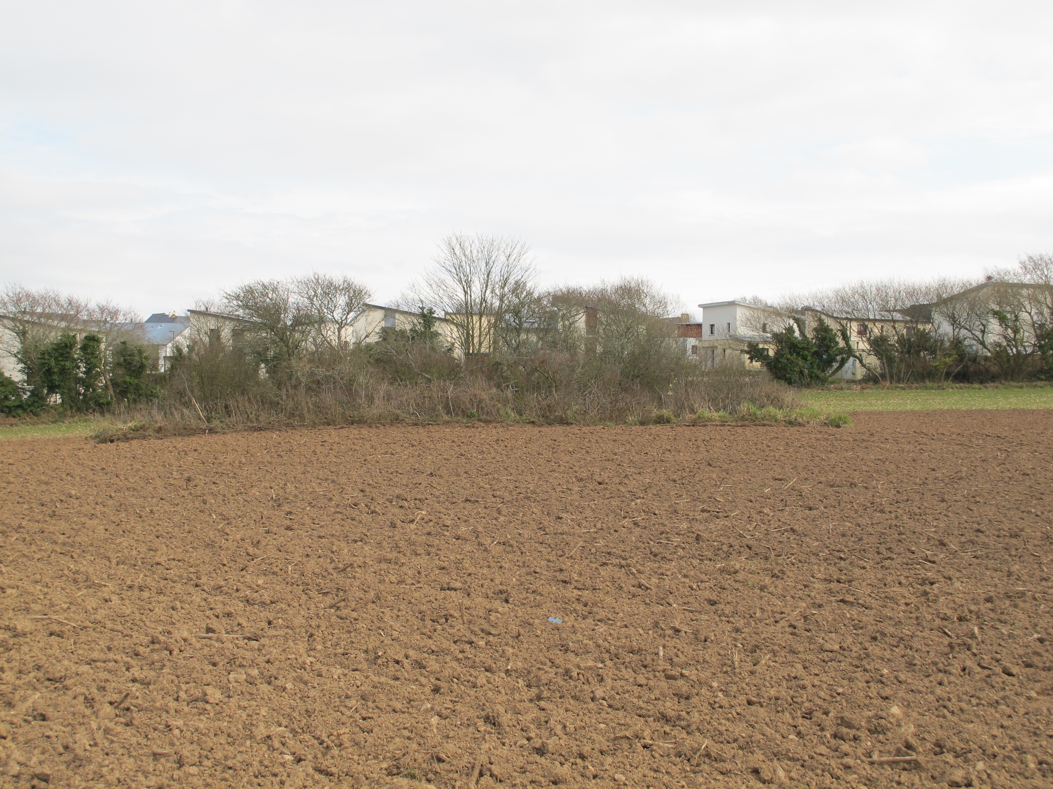 Vue de situation du bunker - abri pour 6 soldats de type VF 1a de Menguen (dans le champ), à l'ouest de l'actuelle rue de Kerléo (état en 2013)Immatriculation