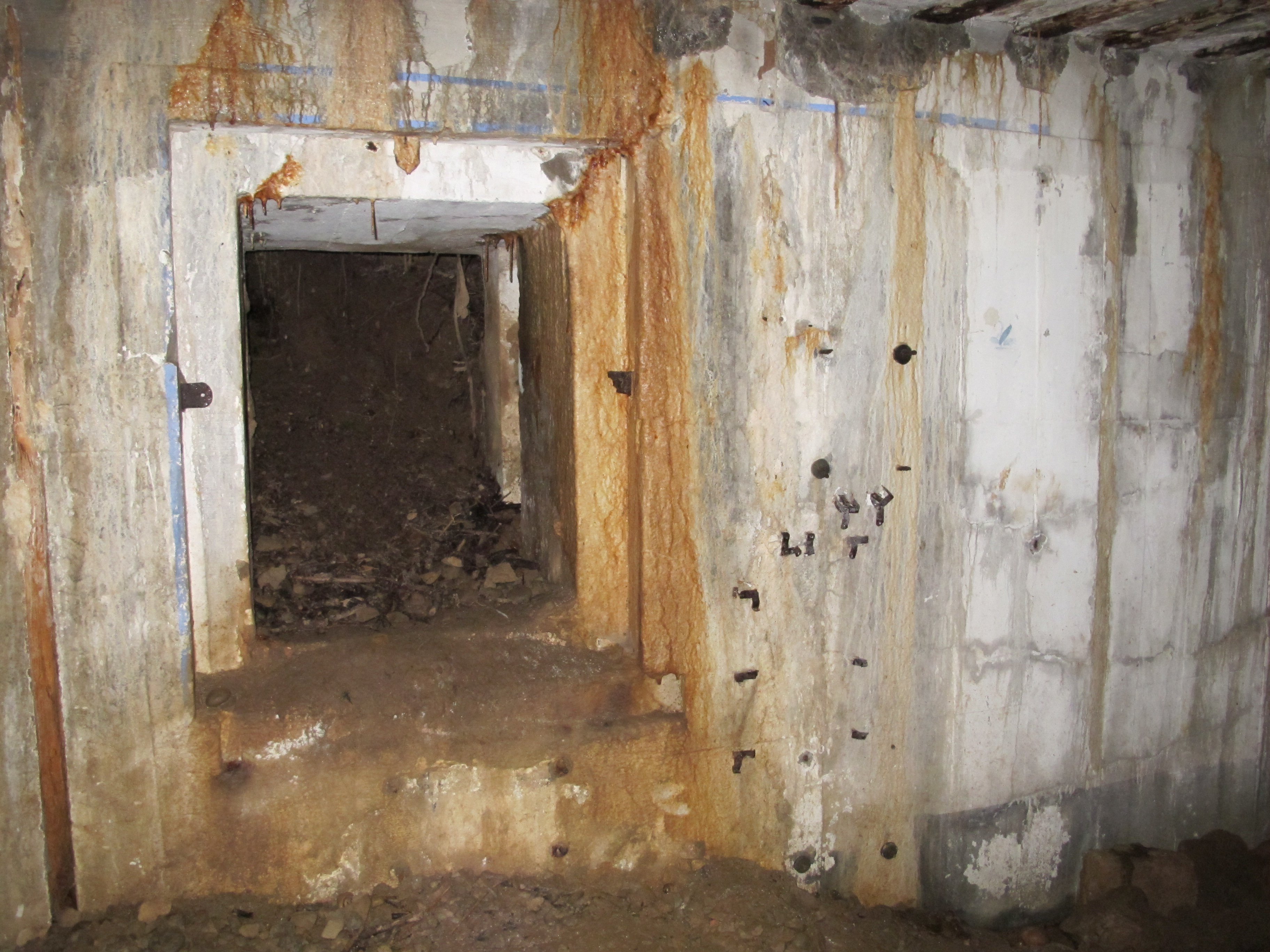 Vue de la sortie de secours de la pièce de vue - chambre de troupe (état en 2013). Sur le mur, liseré de couleur bleue faisant frise et fleurImmatriculation