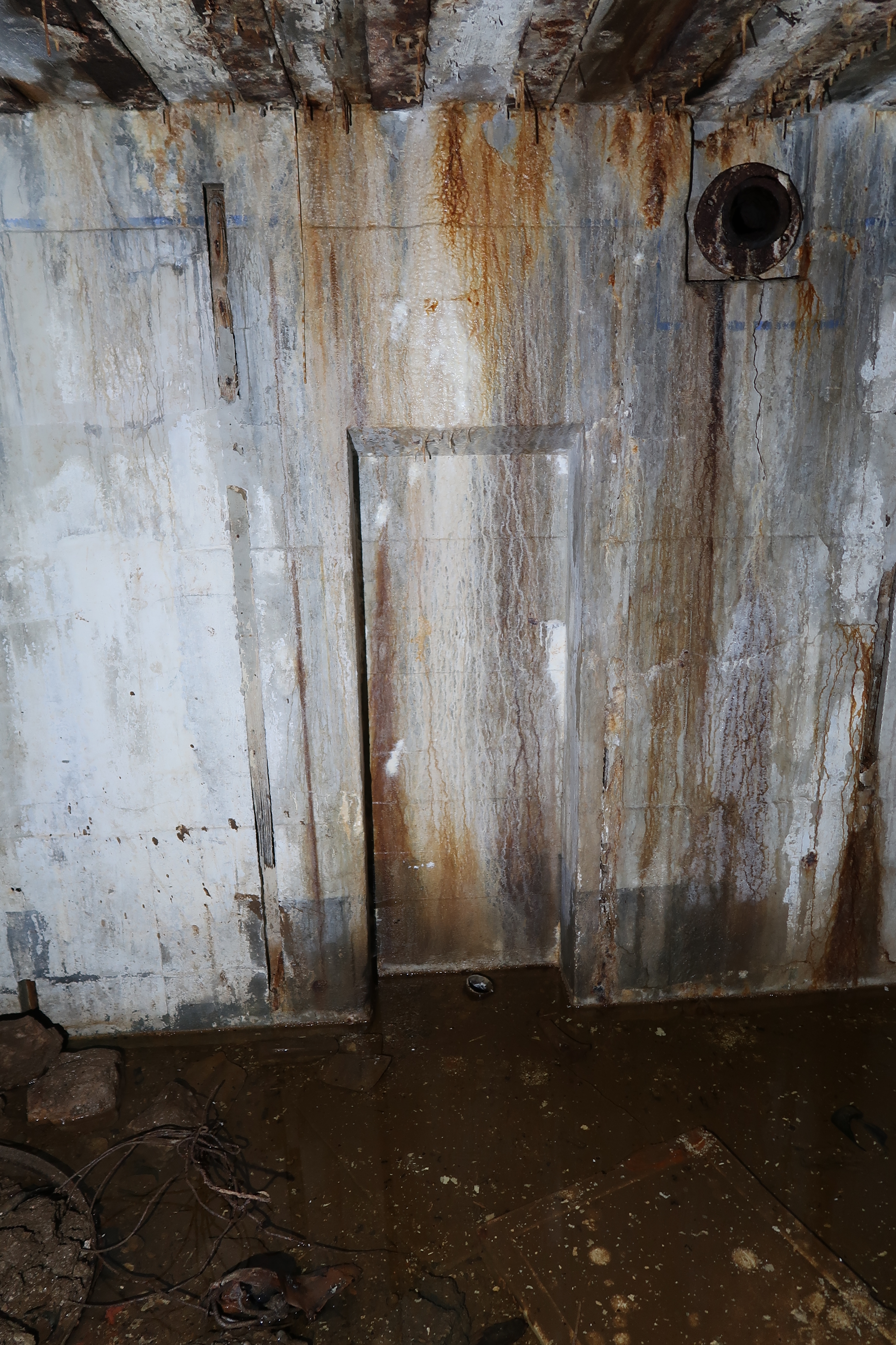 Vue de la pièce de vue - chambre de troupe (état en 2021). Sur le mur doté d'une niche, liseré de couleur bleue faisant friseImmatriculation