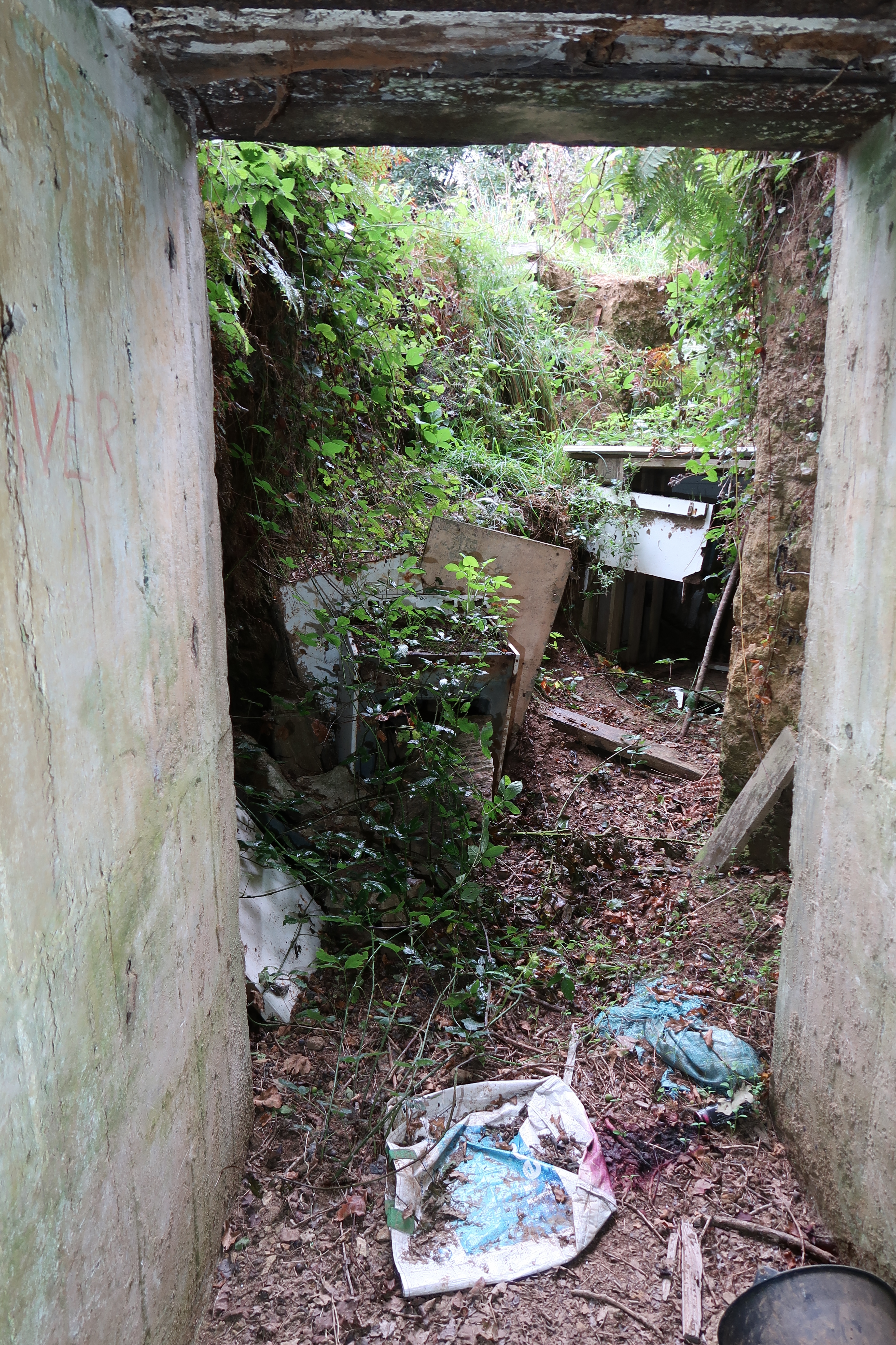 Vue de l'entrée est (état en 2021). Face à l'entrée, une tranchée a été réaménagée ; elle est envahie par des déchets...Immatriculation