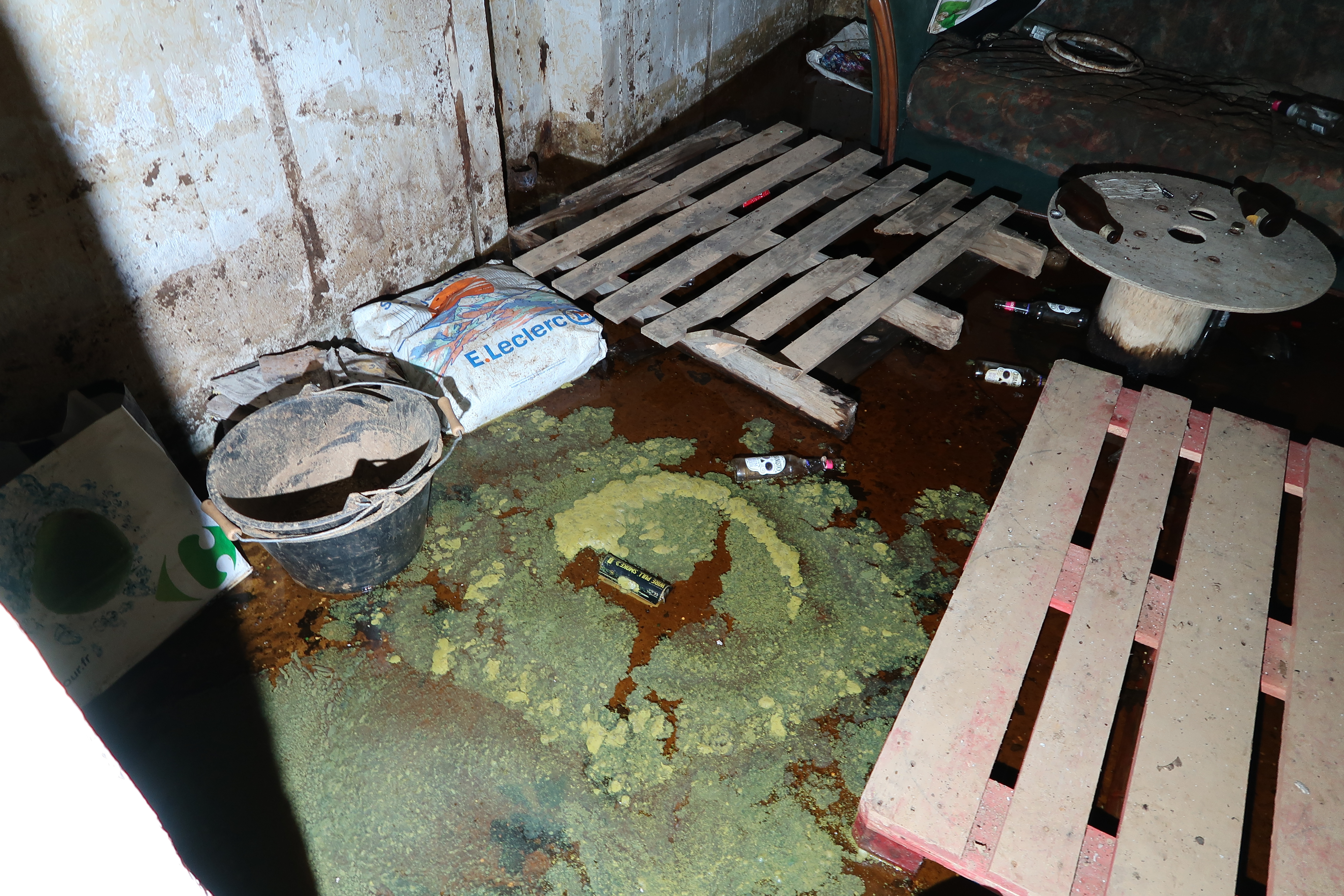 Vue de la pièce de vie - chambre de troupe. Cette pièce dotée de mobilier est en partie inondée (état en 2021)Immatriculation