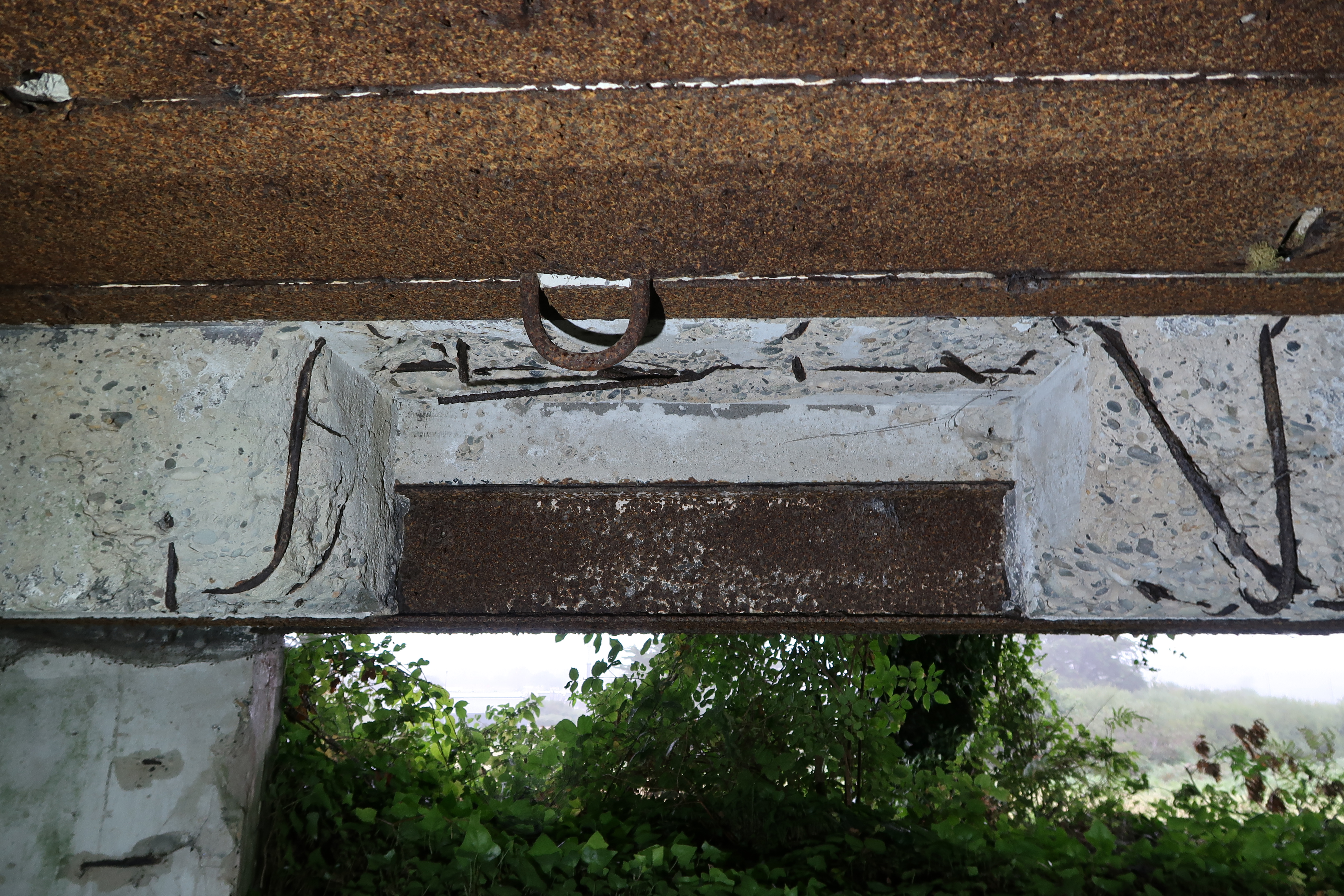 Vue de l'embrasure depuis l'intérieur de la chambre de tir : détail de la fixation du canon (état en 2021)Immatriculation