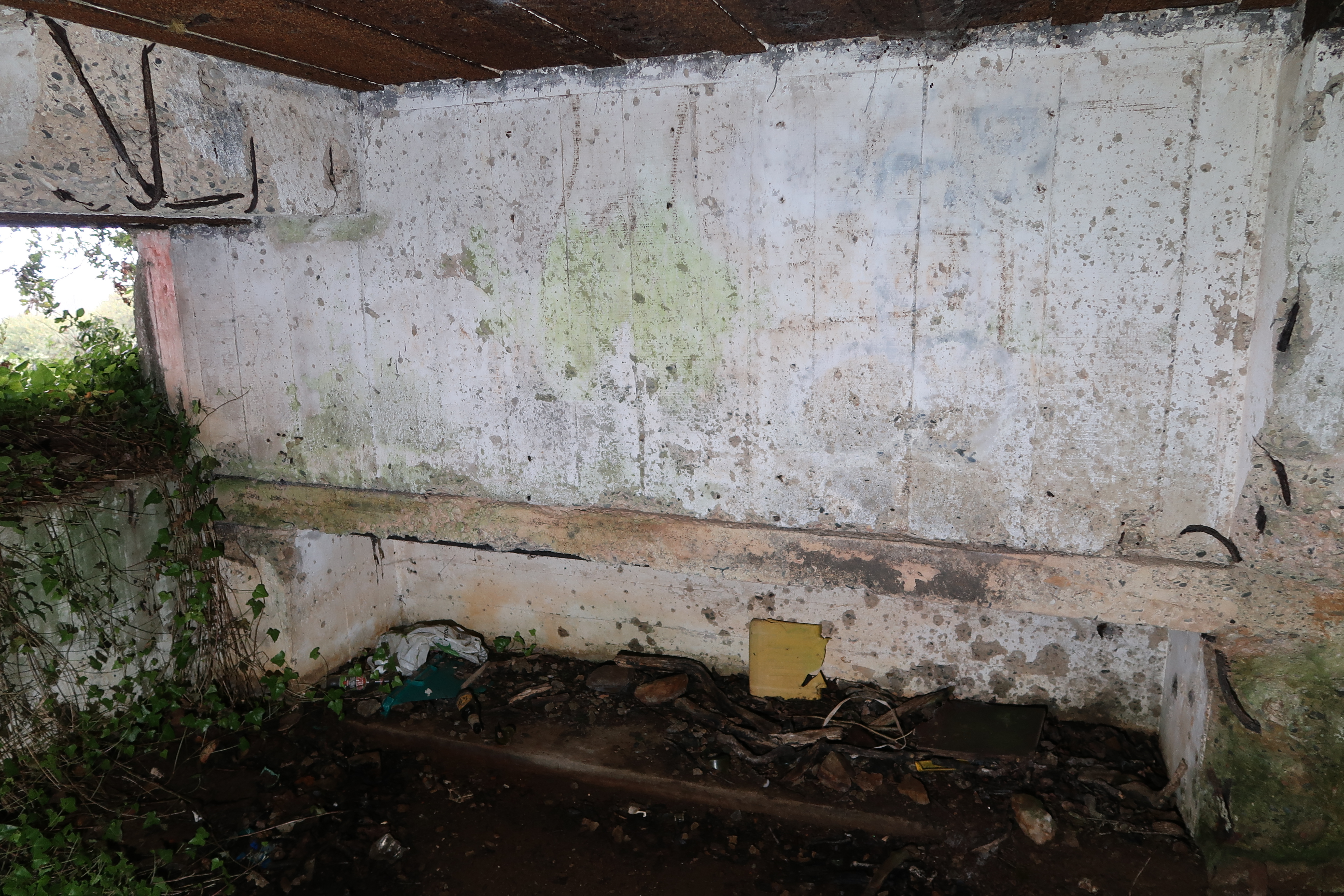 Vue de la chambre de tir : mur ouest (état en 2021). Au ras du sol, longue niche murale pour le stockage des munitionsImmatriculation