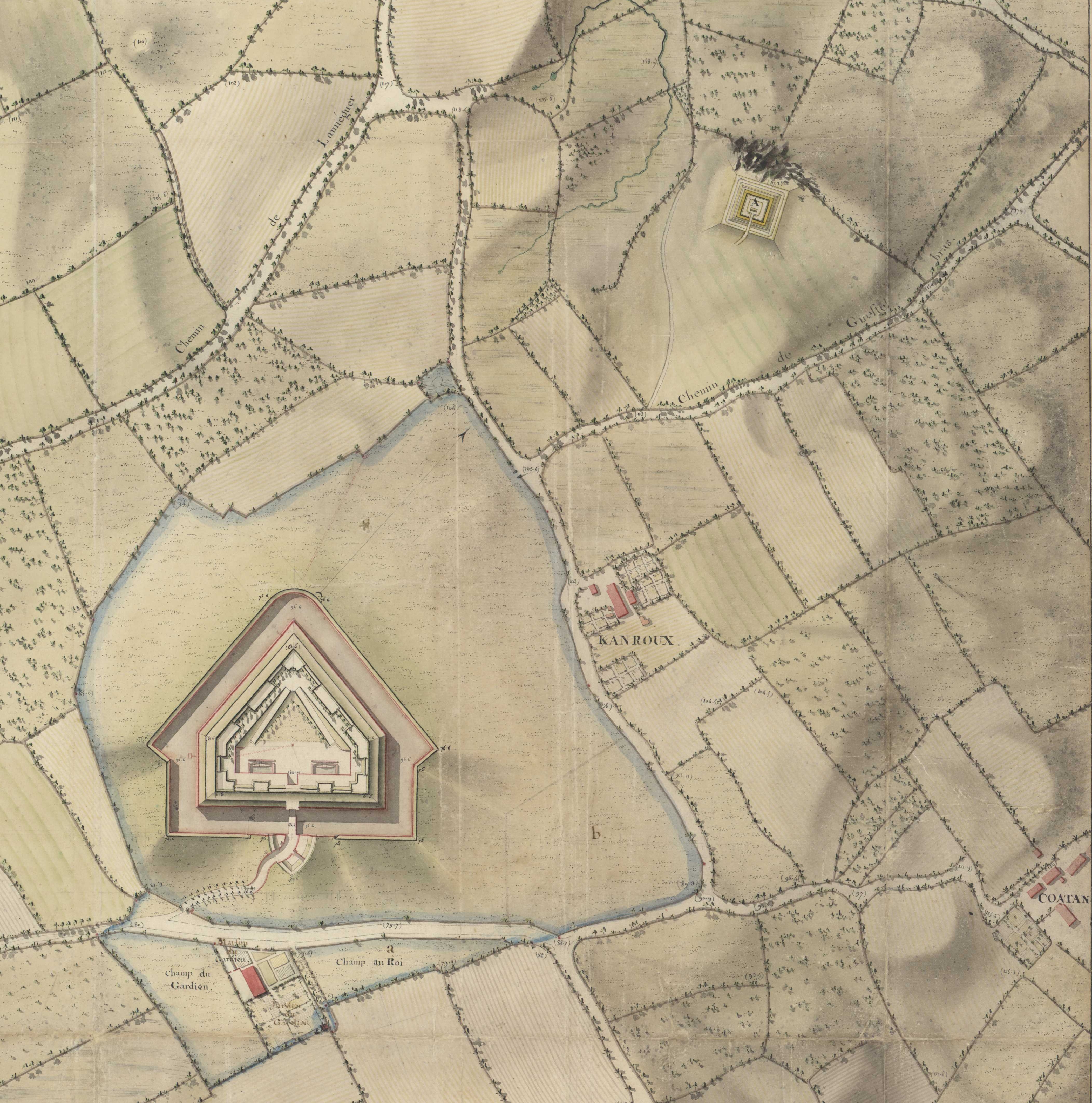 Extrait du plan du Fort de Keranroux avec ses environs, 1782 (Archives départementales du Finistère, 9 Fi 1). Au nord du fort (lavé de jaune), redoute intermédiaire du camp retranché de Saint-Pierre à l'état de projetImmatriculation