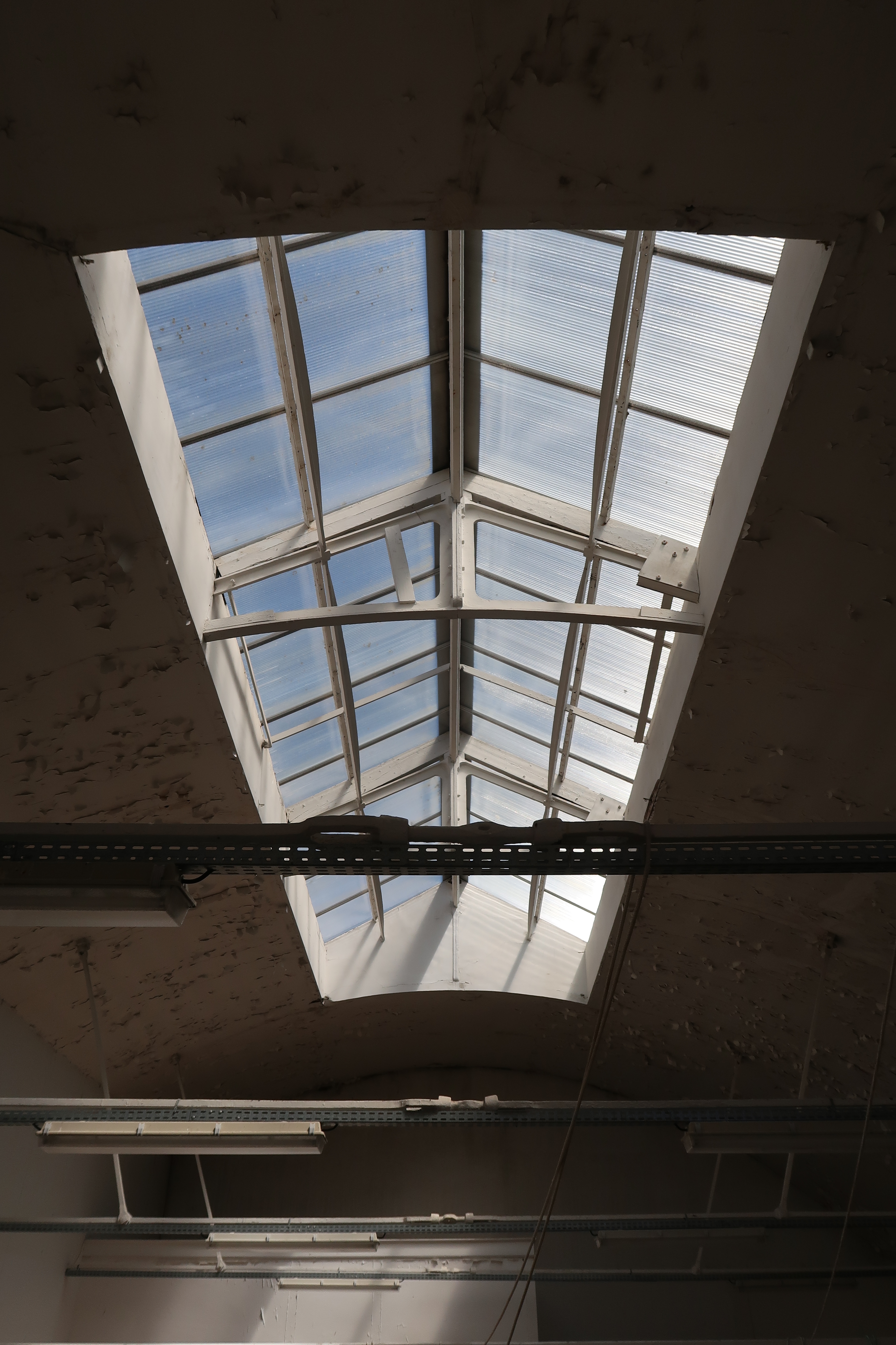 Vue de l'un des anciens bâtiments industriels : charpente métallique et lanterneau (état en 2022)Immatriculation