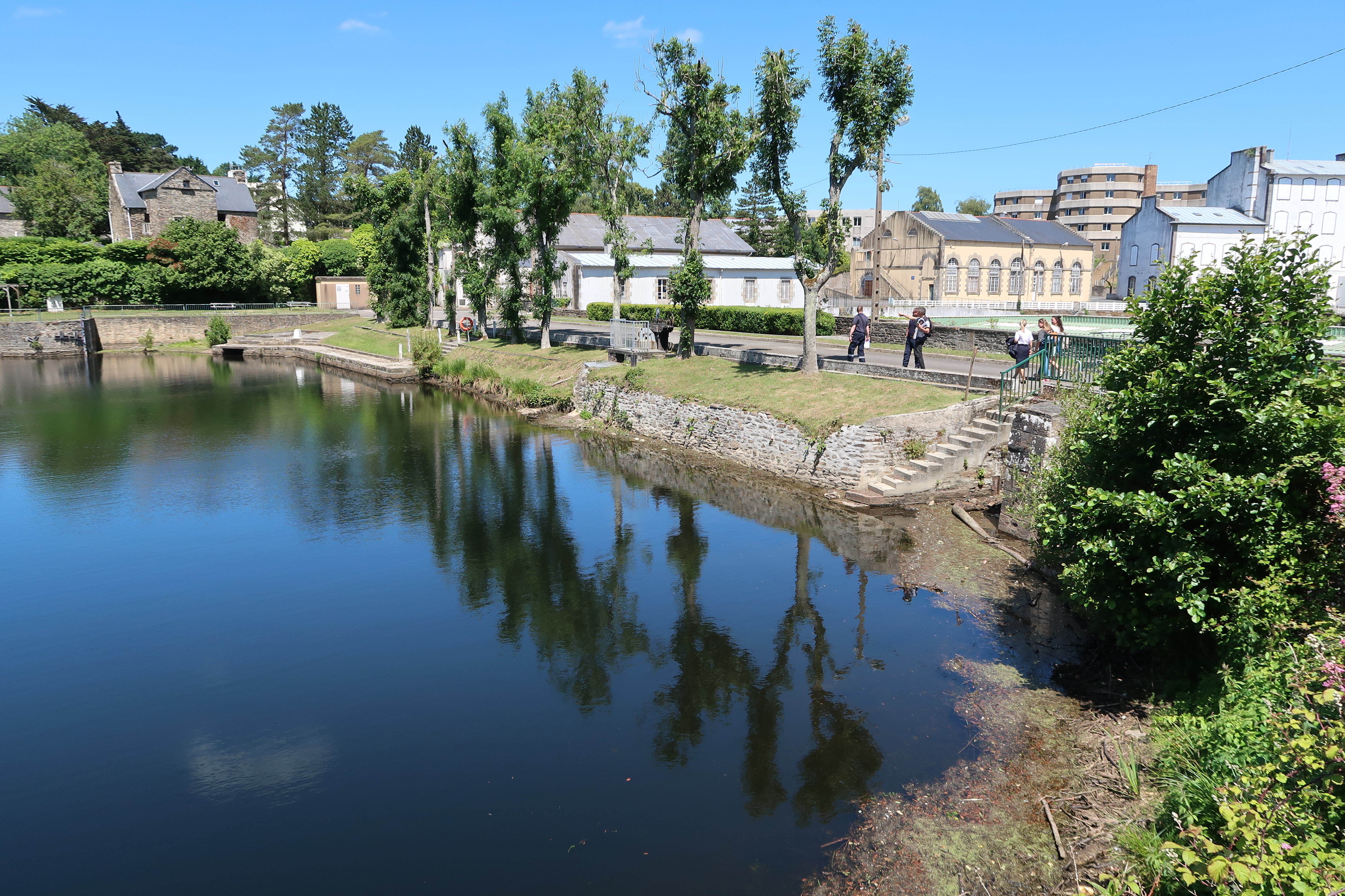 Vue générale de l'étang et de sa digue depuis le sud (état en 2022). A droite, casernes et édifices logistiquesImmatriculation