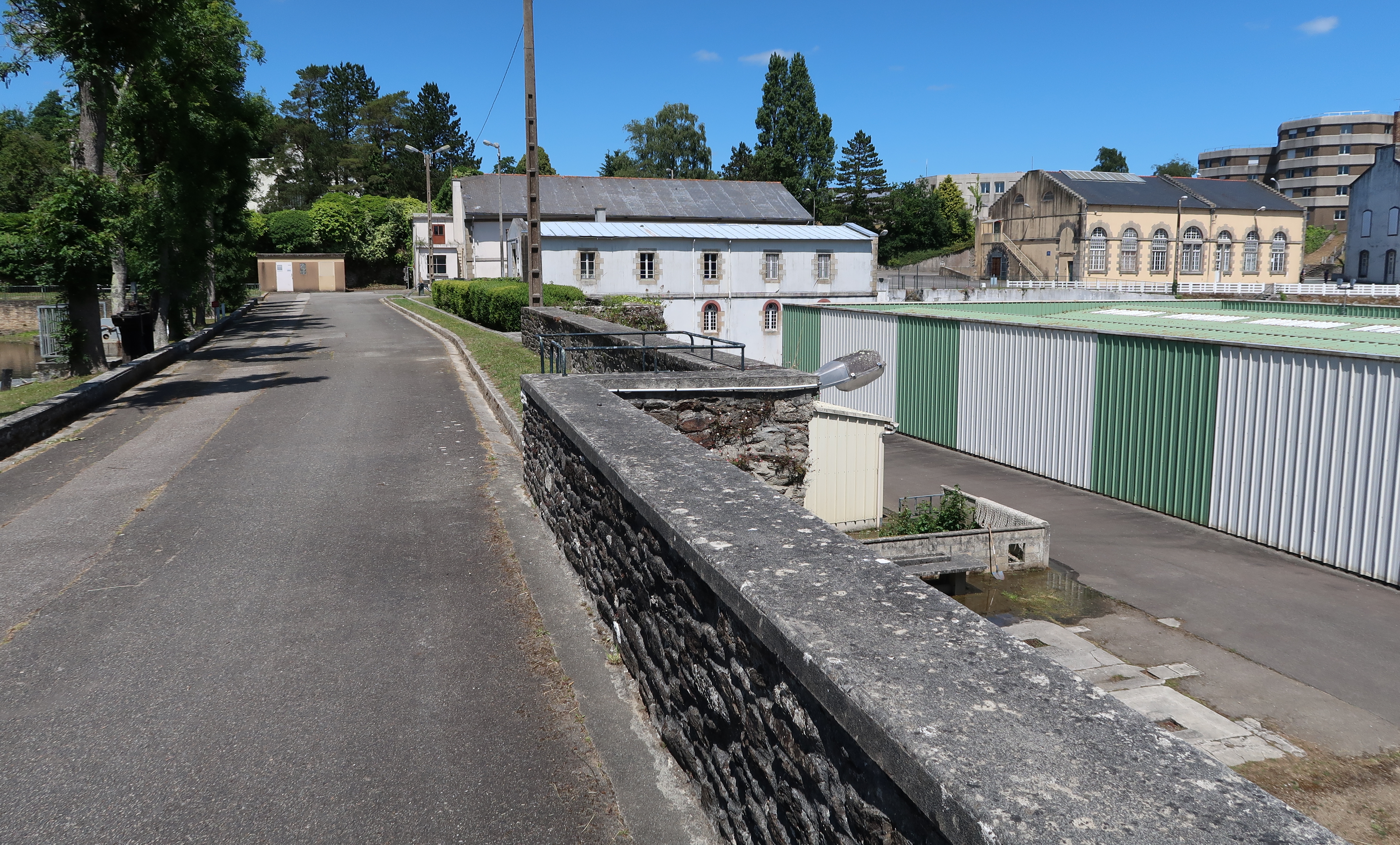 Vue générale de la digue vers le nord (état en 2022). Au centre et à droite, anciens bâtiments des forgesImmatriculation
