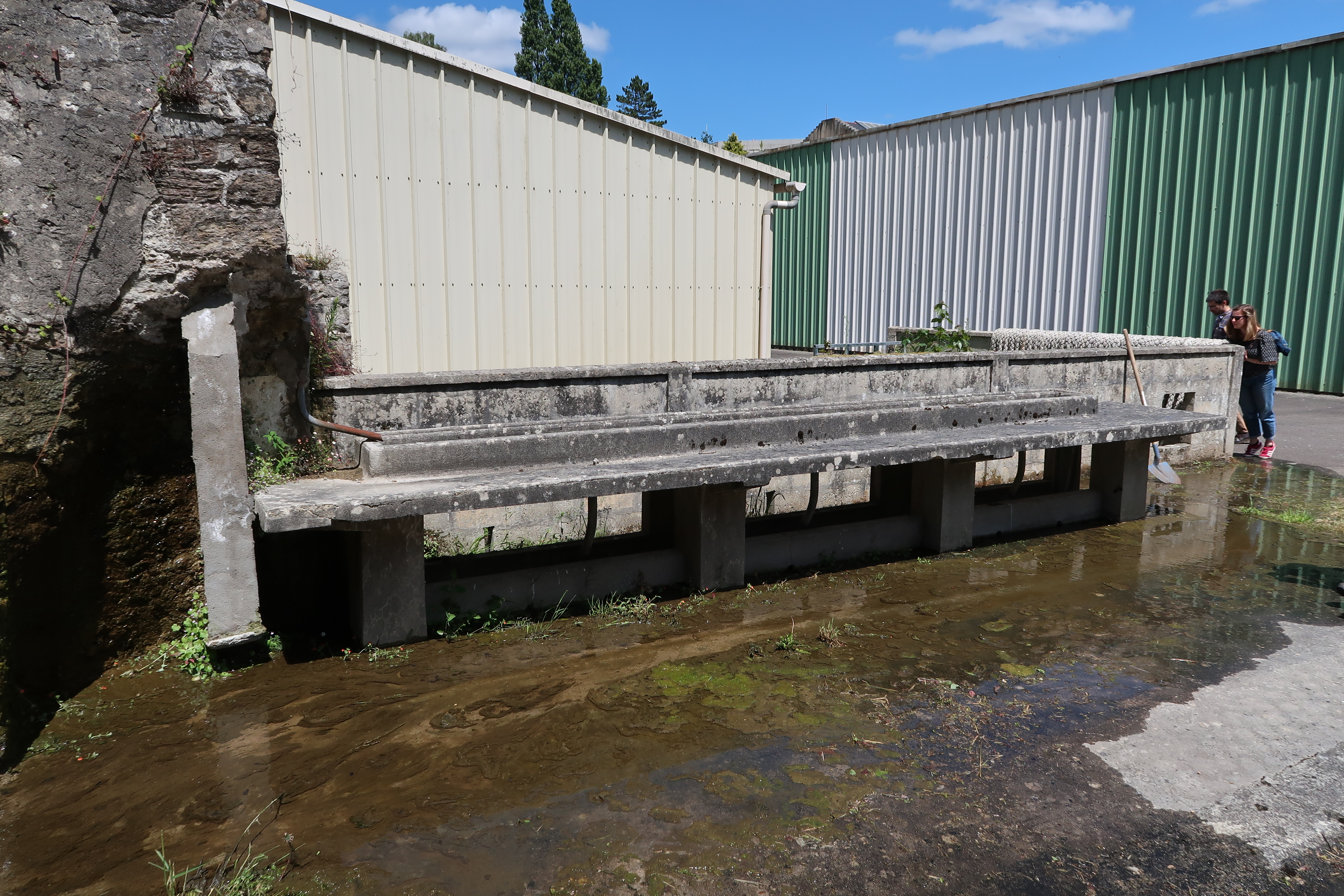 Vue de l'un des deux lavabos collectifs en béton armé (état en 2022). Il est disposé perpendiculairement à la digue de l'étangImmatriculation