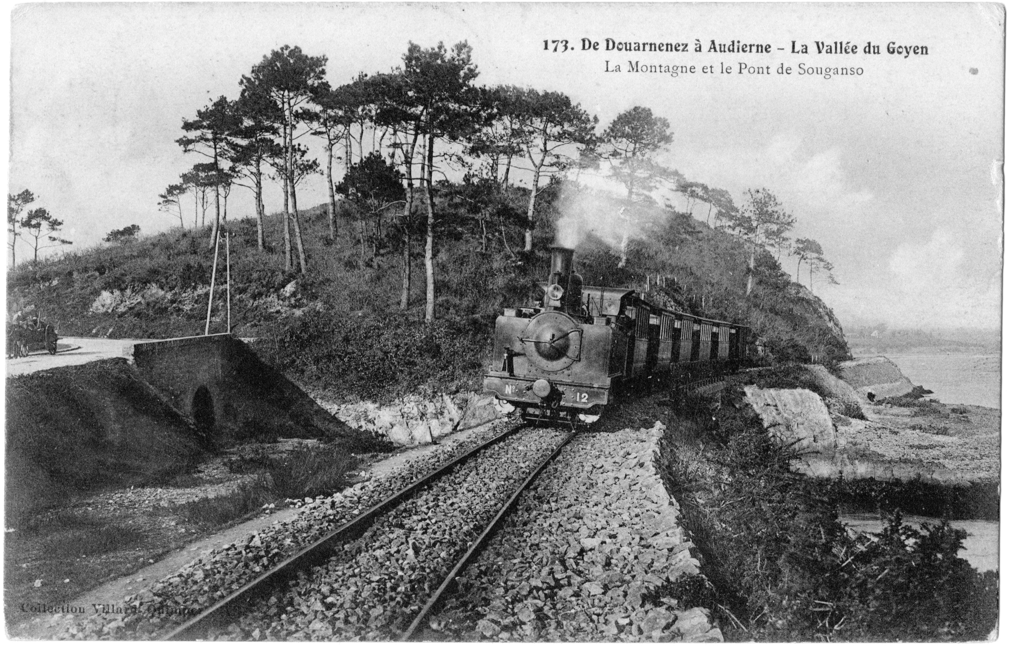 Ligne Audierne-Douarnenez au niveau de l'anse de Sugensou vers 1900. Pont ferroviaire dit "pont physique". Reproduction carte postale ancienne.Immatriculation