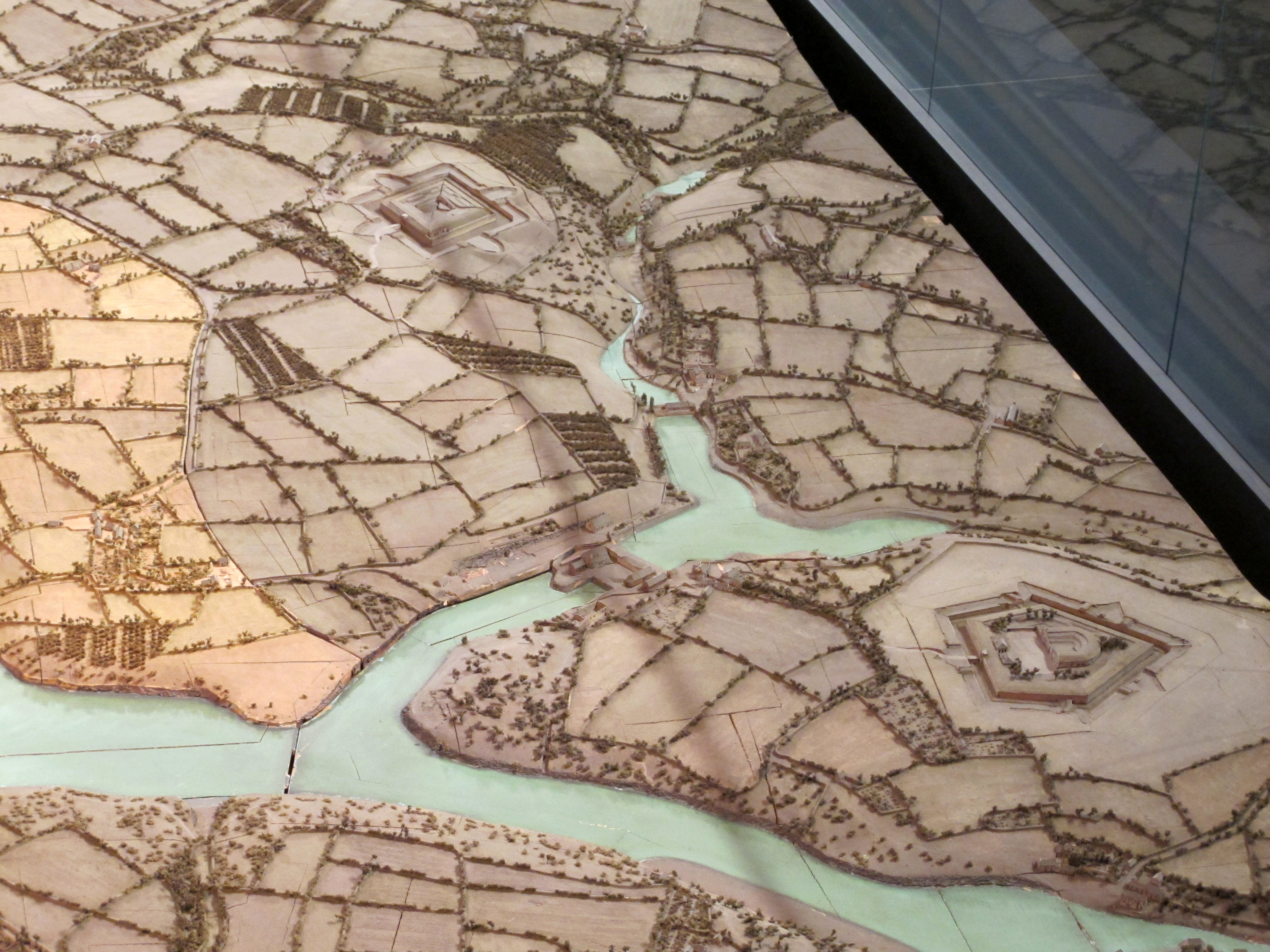 Vue de situation du Fort de Penfeld et de la Redoute de Guestel-Bras depuis le nord-est sur le plan-relief de Brest (1807-1811). Quasiment au centre de la photographie, les forges de la Villeneuve implantées sur la PenfeldImmatriculation