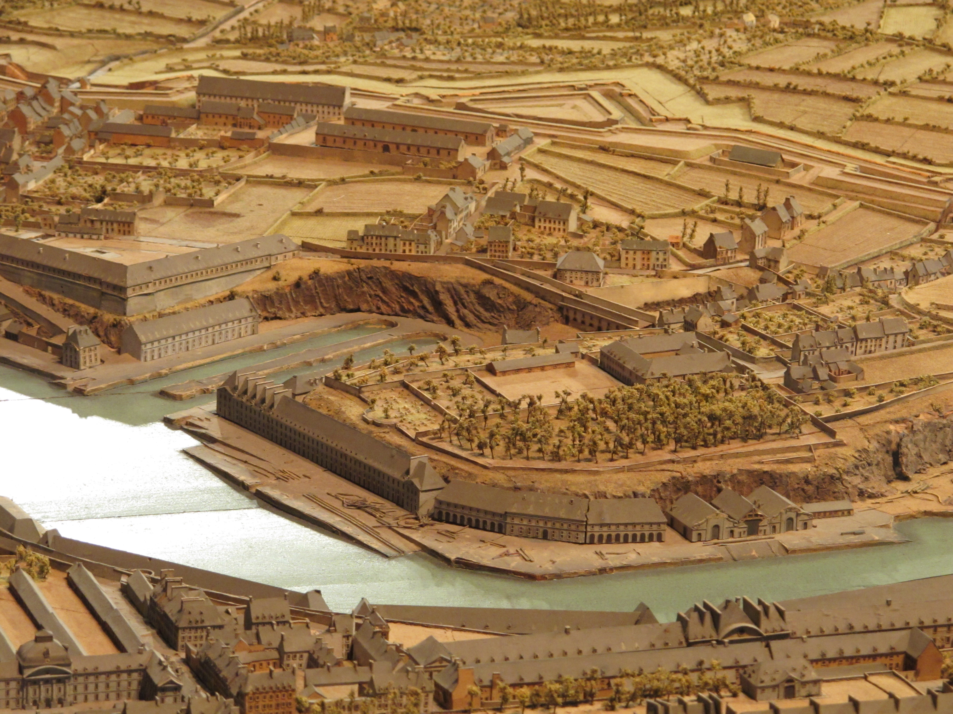 Vue générale du plan-relief de Brest depuis l'Est-nord-est (1807-1811) : la Penfeld et l'anse de Pontaniou. Dominant la Penfeld, l'ancien couvent des Capucins et ses jardins ; la nouvelle prison maritime de Pontaniou immédiatement derrière le Bâtiment aux LionsImmatriculation